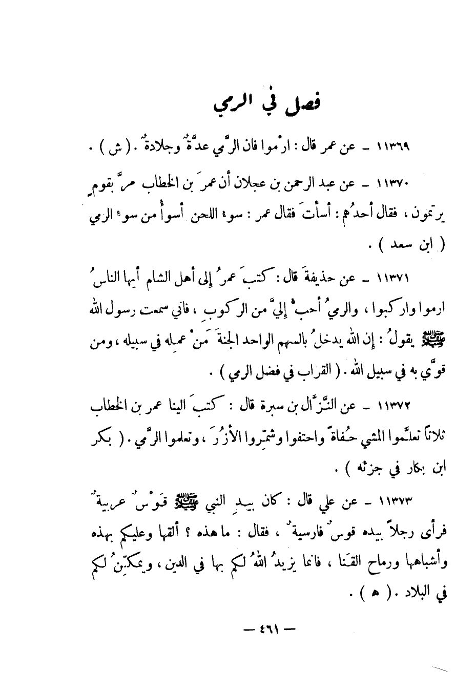 11373- عن علي قال: كان بيد النبي صلى الله عليه وسلم قوس عربية فرأى رجلا بيده قوس فارسية، فقال: ما هذه؟ ألقها وعليكم بهذه وأشباهها ورماح القنا، فإنما يزيد الله لكم بها في الدين، ويمكن لكم في البلاد. "هـ".