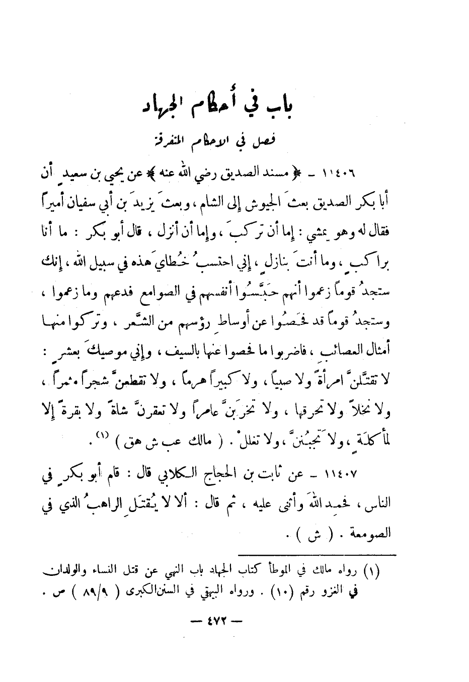 1 رواه مالك في الموطأ كتاب الجهاد باب النهي عن قتل النساء والولدان في الغزو رقم "10". ورواه البيهقي في السنن الكبرى "9/89" ص.