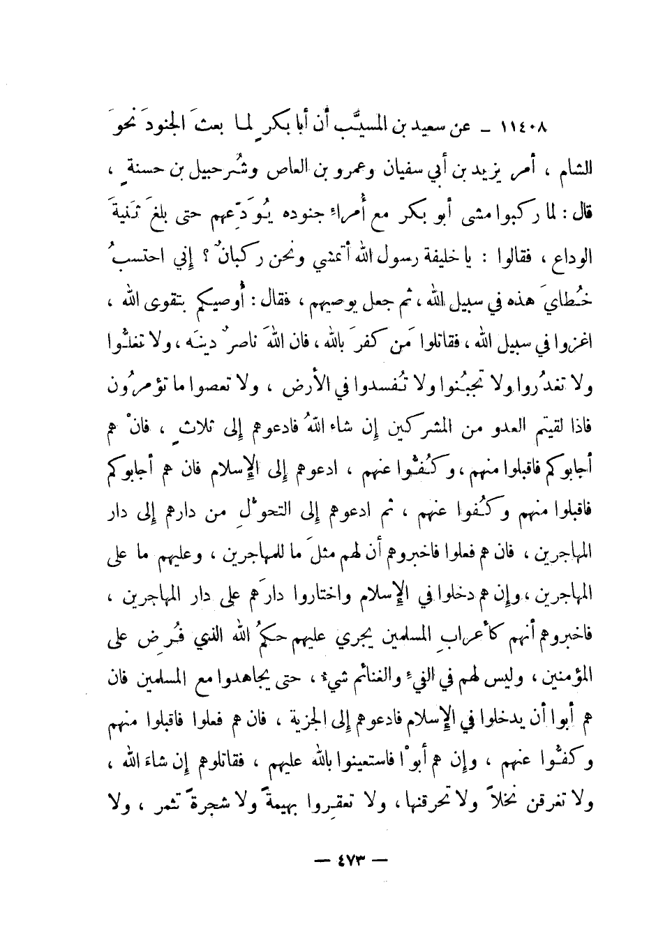 11408- عن سعيد بن المسيب أن أبا بكر لما بعث الجنود نحو الشام، أمر يزيد بن أبي سفيان وعمرو بن العاص وشرحبيل بن حسنة، قال: لما ركبوا مشى أبو بكر مع أمراء جنوده يودعهم حتى بلغ ثنية الوداع، فقالوا: يا خليفة رسول الله أتمشي ونحن ركبان؟ إني أحتسب خطاي هذه في سبيل الله، ثم جعل يوصيهم، فقال: أوصيكم بتقوى الله، اغزوا في سبيل الله، فقاتلوا من كفر بالله، فإن الله ناصر دينه، ولا تغلوا ولا تغدروا ولا تجبنوا ولا تفسدوا في الأرض، ولا تعصوا ما تؤمرون فإذا لقيتم العدو من المشركين إن شاء الله فادعوهم إلى ثلاث، فإن هم أجابوكم فاقبلوا منهم، وكفوا عنهم، ثم ادعوهم إلى الإسلام فإن هم أجابوكم فاقبلوا منهم وكفوا عنهم ثم ادعوهم إلى التحول من دارهم إلى دار المهاجرين، فإن هم فعلوا فأخبروهم أن لهم مثل ما للمهاجرين، وعليهم ما على المهاجرين، وإن هم دخلوا في الإسلام واختاروا دارهم على دار المهاجرين، فأخبروهم أنهم كأعراب المسلمين يجري عليهم حكم الله الذي فرض على المؤمنين، وليس لهم في الفيء والغنائم شيء، حتى يجاهدوا مع المسلمين فإن هم أبوا أن يدخلوا في الإسلام فادعوهم إلى الجزية، فإن هم فعلوا فاقبلوا منهم وكفوا عنهم، وإن هم أبوا فاستعينوا بالله عليهم، فقاتلوهم إن شاء الله، ولا تغرقن نخلا ولا تحرقنها، ولا تعقروا بهيمة ولا شجرة تثمر، ولا