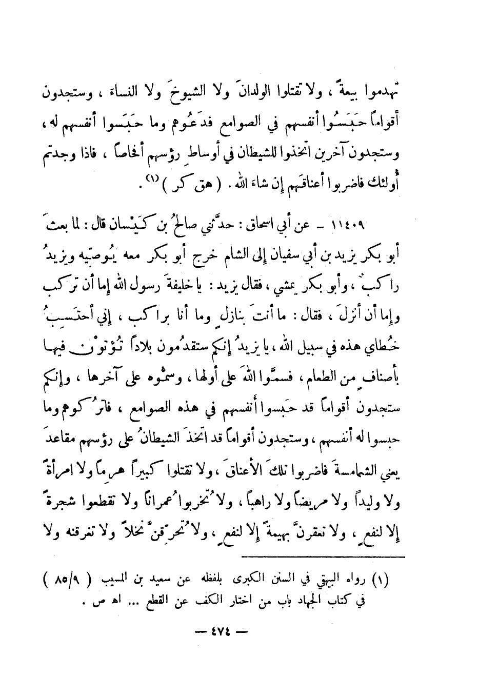 11409- عن أبي إسحاق: حدثني صالح بن كيسان قال: لما بعث أبو بكر يزيد بن أبي سفيان إلى الشام خرج أبو بكر معه يوصيه ويزيد راكب، وأبو بكر يمشي، فقال يزيد: يا خليفة رسول الله إما أن تركب وإما أن أنزل، فقال: ما أنت بنازل وما أنا براكب، إني أحتسب خطاي هذه في سبيل الله، يا يزيد إنكم ستقدمون بلادا تؤتون فيها بأصناف من الطعام، فسموا الله على أولها، وسموه على آخرها، وإنكم ستجدون أقواما قد حبسوا أنفسهم في هذه الصوامع، فاتركوهم وما حبسوا له أنفسهم، وستجدون أقواما قد اتخذ الشيطان على رؤسهم مقاعد يعني الشمامسة فاضربوا تلك الأعناق، ولا تقتلوا كبيرا هرما ولا امرأة ولا وليدا ولا مريضا ولا راهبا، ولا تخربوا عمرانا ولا تقطعوا شجرة إلا لنفع، ولا تعقرن بهيمة إلا لنفع، ولا تحرقن نخلا ولا تغرقنه ولا