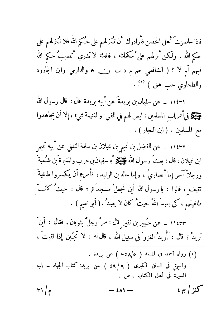 11431- عن سليمان بن بريدة عن أبيه بريدة قال: قال رسول الله صلى الله عليه وسلم في أعراب المسلمين: ليس لهم في الفيء والغنيمة شيء، إلا أن يجاهدوا مع المسلمين. "ابن النجار".