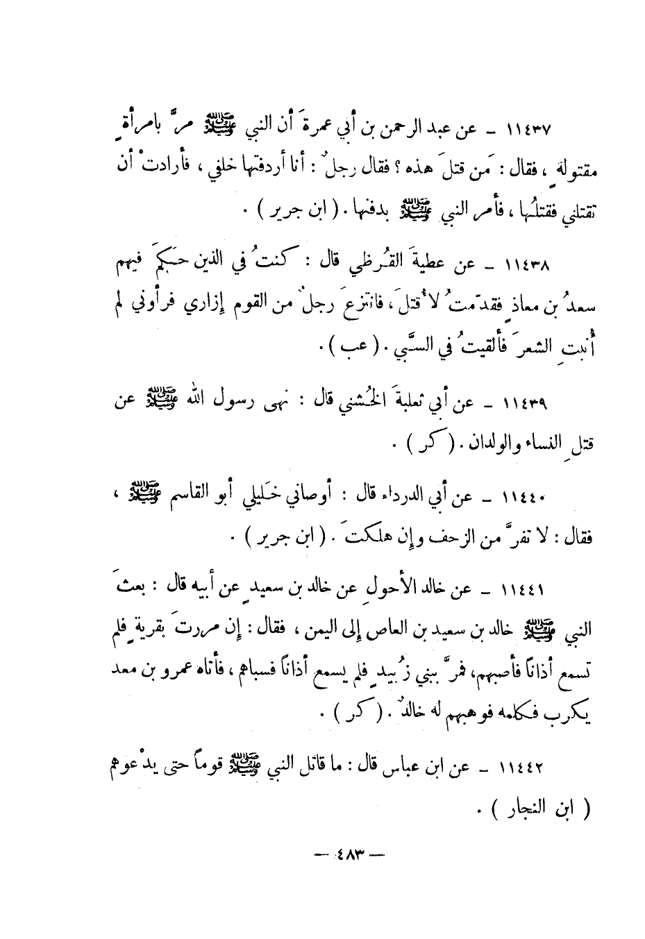 11439- عن أبي ثعلبة الخشني قال: نهى رسول الله صلى الله عليه وسلم عن قتل النساء والولدان. "كر".