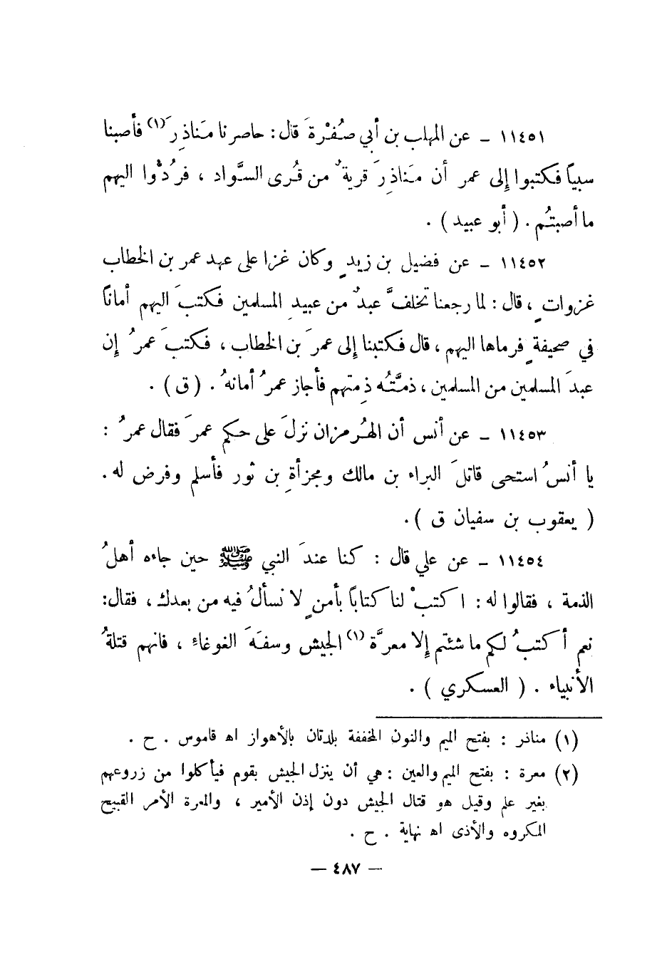 11451 - عن المهلب بن أبي صفرة قال: حاصرنا مناذر 1 فأصبنا سبيا فكتبوا إلى عمر أن مناذر قرية من قرى السواد، فردوا إليهم ما أصبتم. "أبو عبيد".