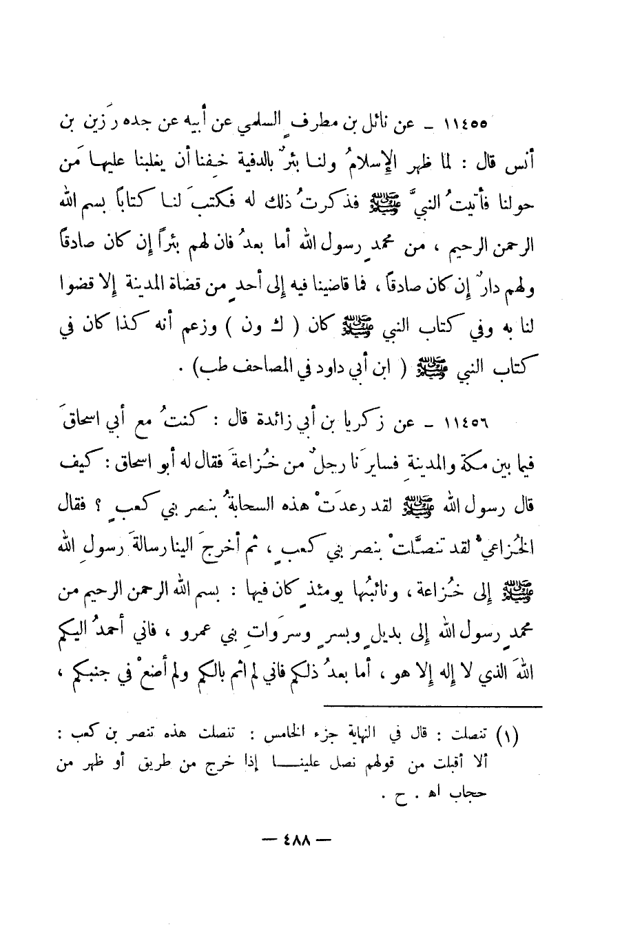11456- عن زكريا بن أبي زائدة قال: كنت مع أبي إسحاق فيما بين مكة والمدينة فسايرنا رجل من خزاعة فقال له أبو إسحاق: كيف قال رسول الله صلى الله عليه وسلم لقد رعدت هذه السحابة بنصر بني كعب؟ فقال الخزاعي لقد تنصلت 1 بنصر بني كعب، ثم أخرج إلينا رسالة رسول الله صلى الله عليه وسلم إلى خزاعة، ونائبها يومئذ كان فيها: بسم الله الرحمن الرحيم من محمد رسول الله إلى بديل وبسر وسروات بني عمرو، فإني أحمد إليكم الله الذي لا إله إلا هو، أما بعد ذلكم فإني لم اثم بالكم ولم أضع في جنبكم،