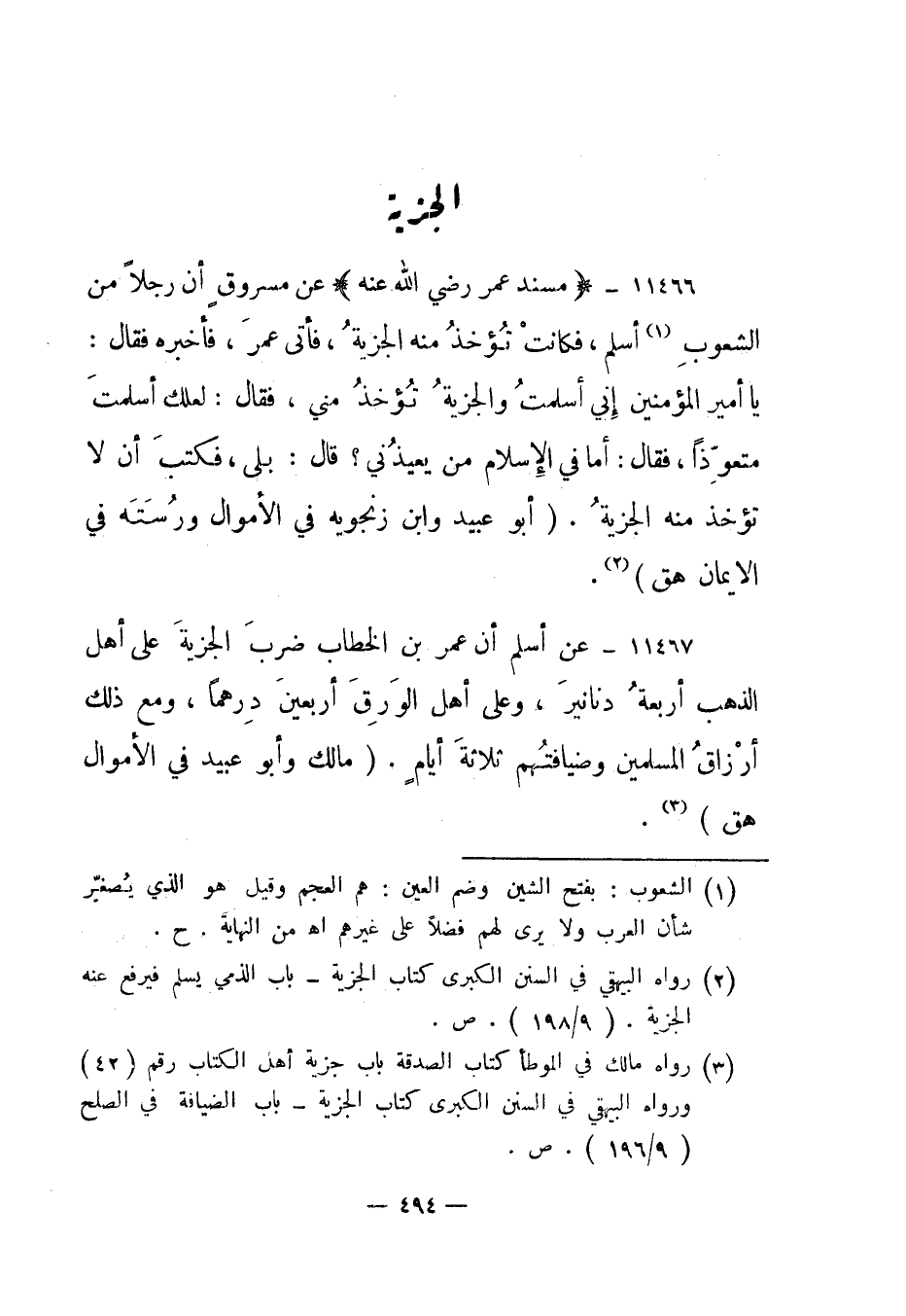 11466- "مسند عمر رضي الله عنه" عن مسروق أن رجلا من الشعوب 1 أسلم، فكانت تؤخذ منه الجزية، فأتى عمر، فأخبره فقال: يا أمير المؤمنين إني أسلمت والجزية تؤخذ مني، فقال: لعلك أسلمت متعوذا، فقال: أما في الإسلام من يعيذني؟ قال: بلى، فكتب أن لا تؤخذ منه الجزية. "أبو عبيد وابن زنجويه في الأموال ورسته في الإيمان هق"2.