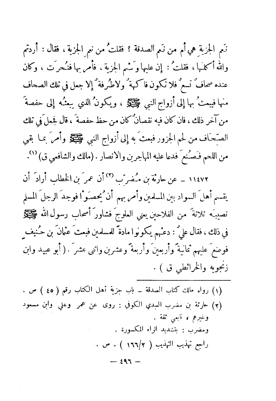 11472- عن حارثة بن مضرب 2 أن عمر بن الخطاب أراد أن يقسم أهل السواد بين المسلمين وأمر بهم أن يحصوا فوجد الرجل المسلم نصيبه ثلاثة من الفلاحين يعني العلوج فشاور أصحاب رسول الله صلى الله عليه وسلم في ذلك، فقال علي: دعهم يكونوا مادة للمسلمين فبعث عثمان بن حنيف فوضع عليهم ثمانية وأربعين وأربعة وعشرين واثنى عشر. "أبو عبيد وابن زنجويه والخرائطي ق".