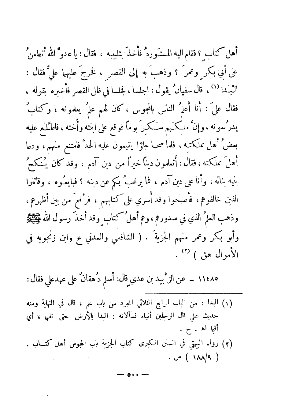 أهل كتاب؟ فقام إليه المستورد فأخذ بتلبيبه، فقال: يا عدو الله أتطعن على أبي بكر وعمر؟ وذهب به إلى القصر، فخرج عليهما علي فقال: البدا 1، قال سفيان يقول: اجلسا، فجلسا في ظل القصر فأخبره بقوله، فقال علي: أنا أعلم الناس بالمجوس، كان لهم علم يعلمونه، وكتاب يدرسونه، وإن ملكهم سكر يوما فوقع على ابنته وأخته، فاطلع عليه بعض أهل مملكته، فلما صحا جاؤا يقيمون عليه الحد فامتنع منهم، ودعا أهل مملكته، فقال: أتعلمون دينا خيرا من دين آدم، وقد كان ينكح بنيه بناته، وأنا على دين آدم، فما يرغب بكم عن دينه؟ فبايعوه، وقاتلوا الذين خالفوهم، فأصبحوا وقد أسري على كتابهم، فرفع من بين أظهرهم، وذهب العلم الذي في صدورهم، وهم اهل كتاب وقد أخذ رسول الله صلى الله عليه وسلم وأبو بكر وعمر منهم الجزية. " الشافعي والعدني ع وابن زنجويه في الأموال هق"2.