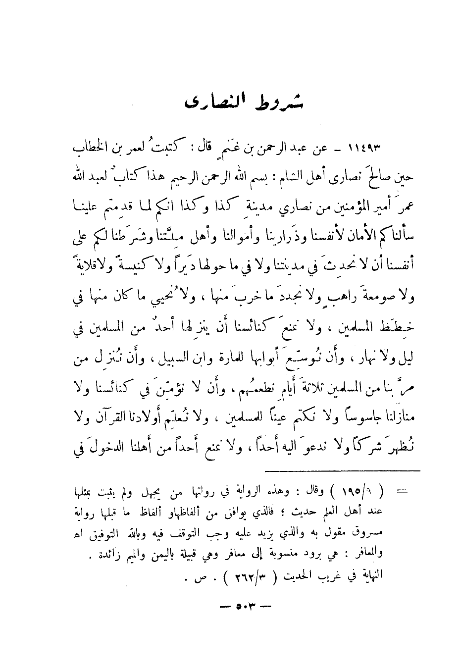 11493- عن عبد الرحمن بن غنم قال: كتبت لعمر بن الخطاب حين صالح نصارى أهل الشام: بسم الله الرحمن الرحيم هذا كتاب لعبد الله عمر أمير المؤمنين من نصاري مدينة كذا وكذا لما قدمتم علينا سألناكم الأمان لأنفسنا وذرارينا وأموالنا وأهل ملتنا وشرطنا لكم على أنفسنا أن لا نحدث في مدينتنا ولا في ما حولها ديرا ولا كنيسة ولا قلاية ولا صومعة راهب ولا نجدد ما خرب منها، ولا نحيي ما كان منها في خطط المسلمين، ولا نمنع كنائسنا أن ينزلها أحد من المسلمين في ليل ولا نهار، وأن نوسع أبوابها للمارة وابن السبيل، وأن ننزل من مر بنا من المسلمين ثلاثة أيام نطعمهم، وأن لا نؤمن في كنائسنا ولا منازلنا جاسوسا ولا نكتم عينا للمسلمين، ولا نعلم أولادنا القرآن ولا نظهر شركا ولا ندعو إليه أحدا، ولا نمنع أحدا من أهلنا الدخول في