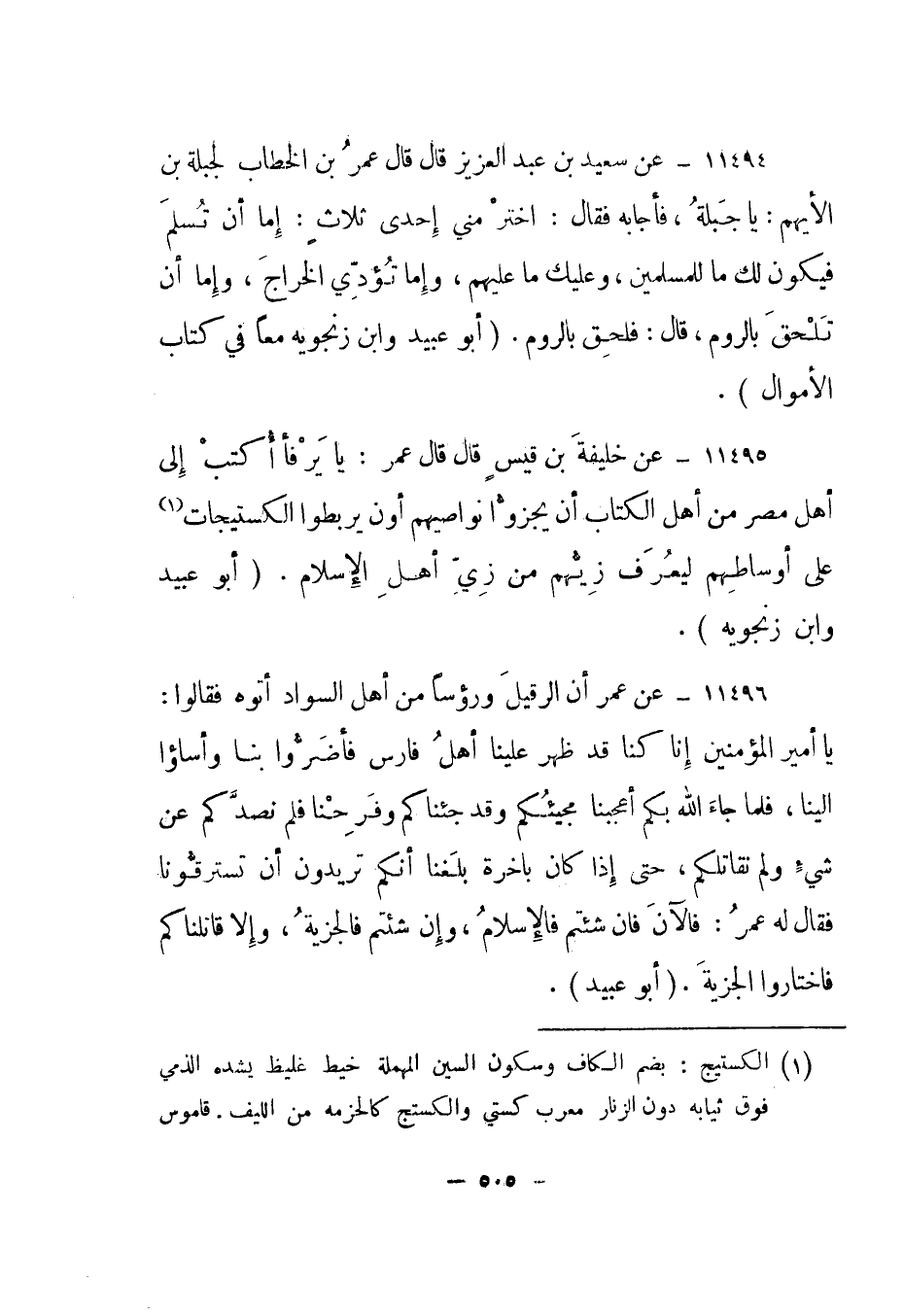 11494- عن سعيد بن عبد العزيز قال قال عمر بن الخطاب لجبلة بن الأيهم: يا جبلة، فأجابه فقال: اختر مني إحدى ثلاث: إما أن تسلم فيكون لك ما للمسلمين، وعليك ما عليهم، وإما تؤدي الخراج، وإما أن تلحق بالروم، قال: فلحق بالروم. "أبو عبيد وابن زنجويه معا في كتاب الأموال".
