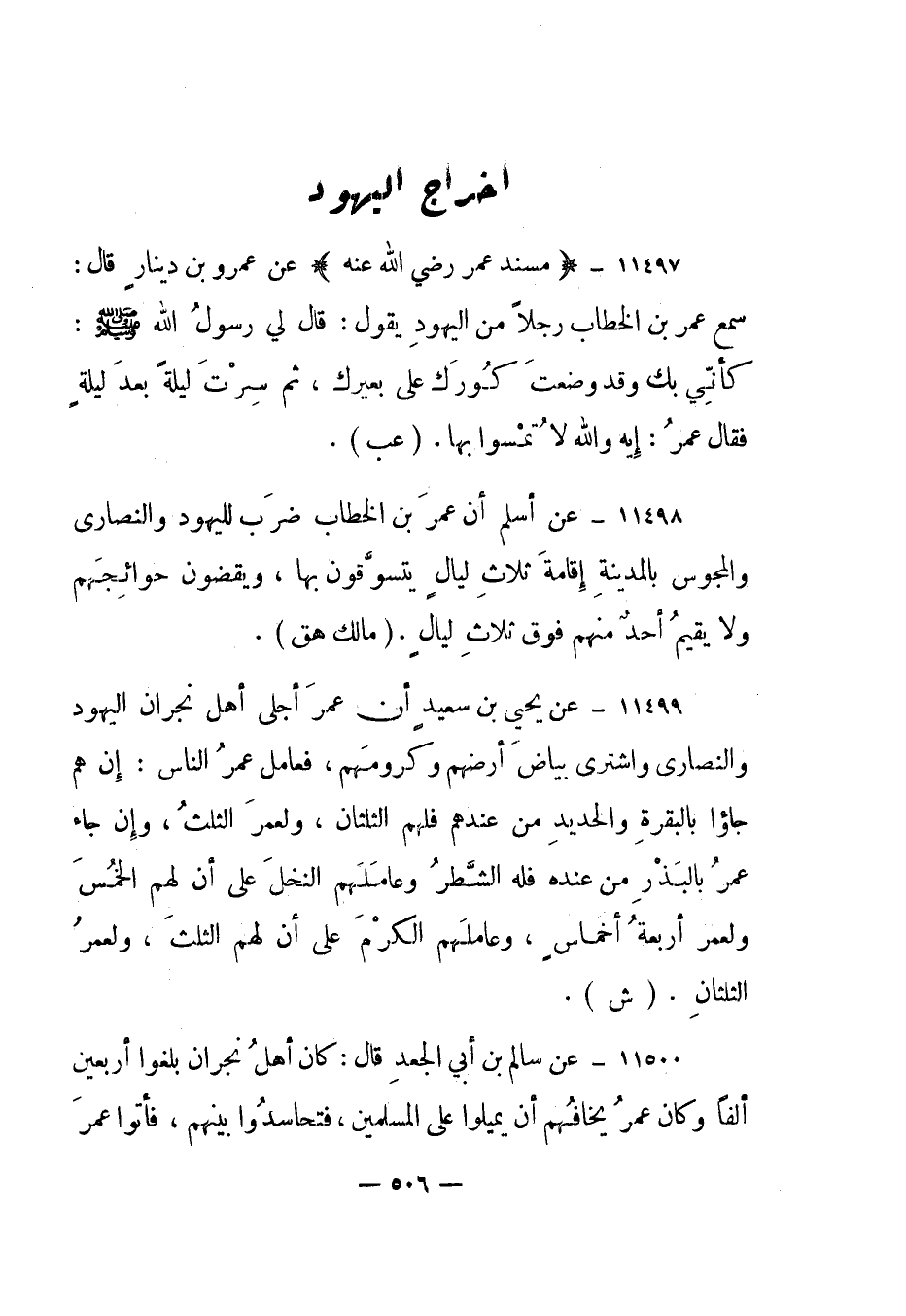 11498- عن أسلم أن عمر بن الخطاب ضرب لليهود والنصارى والمجوس بالمدينة إقامة ثلاث ليال يتسوقون بها، ويقضون حوائجهم ولا يقيم أحد منهم فوق ثلاث ليال. " مالك هق".