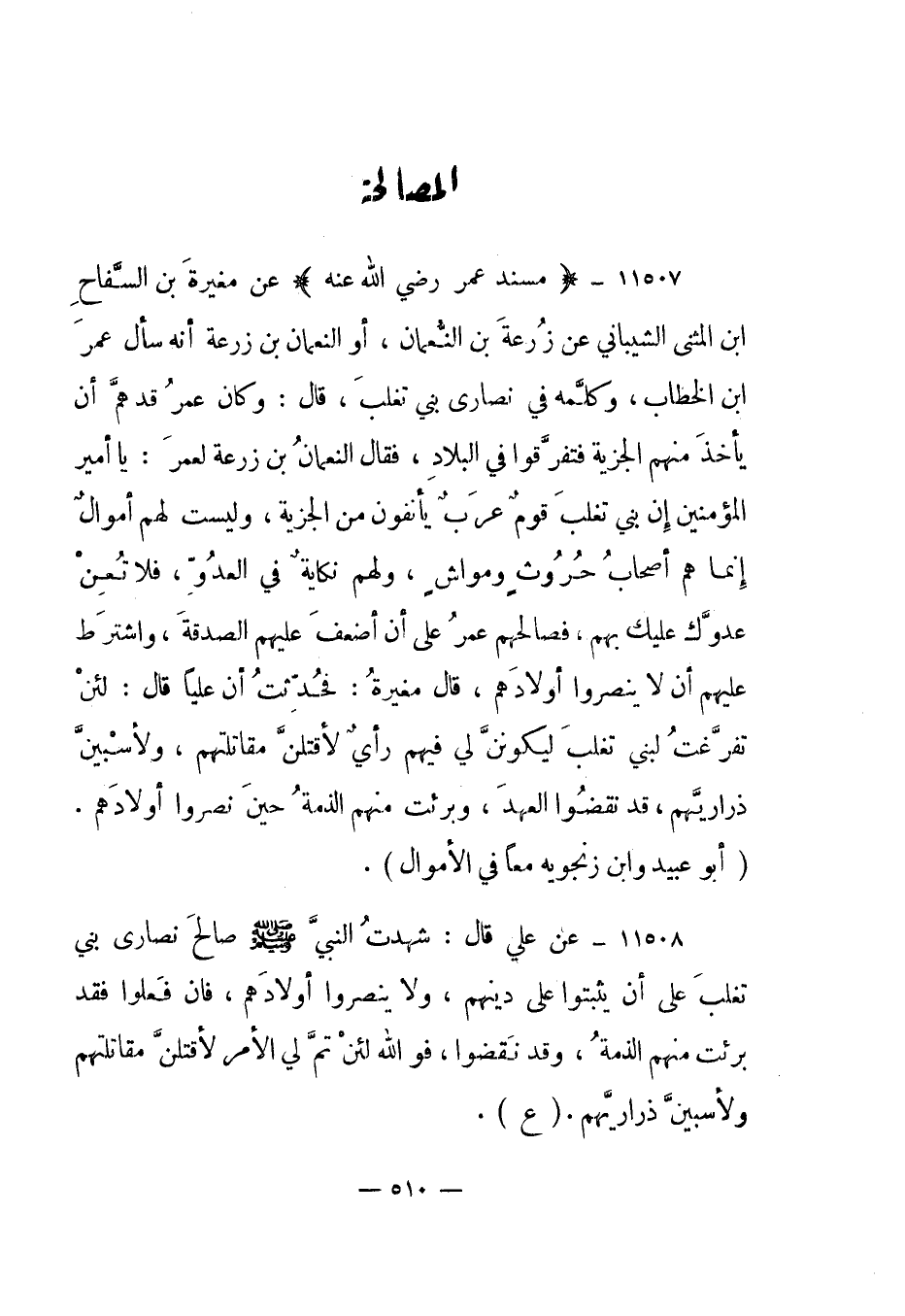 11507- "مسند عمر رضي الله عنه" عن مغيرة بن السفاح ابن المثنى الشيباني عن زرعة بن النعمان، أو النعمان بن زرعة أنه سأل عمر ابن الخطاب، وكلمه في نصارى بني تغلب، قال: وكان عمر قد هم أن يأخذ منهم الجزية فتفرقوا في البلاد، فقال النعمان بن زرعة لعمر: يا أمير المؤمنين إن بني تغلب قوم عرب يأنفون من الجزية، وليست لهم أموال إنما هم أصحاب حروث ومواش، ولهم نكاية في العدو، فلا تعن عدوك عليك بهم، فصالحهم عمر على أن أضعف عليهم الصدقة، واشترط عليهم أن لا ينصروا أولادهم، قال مغيرة: فحدثت أن عليا قال: لئن تفرغت لبني تغلب ليكونن لي فيهم رأي لأقتلن مقاتلتهم، ولأسبين ذراريهم، قد نقضوا العهد، وبرئت منهم الذمة حين نصروا أولادهم. "أبو عبيد وابن زنجويه معا في الأموال".