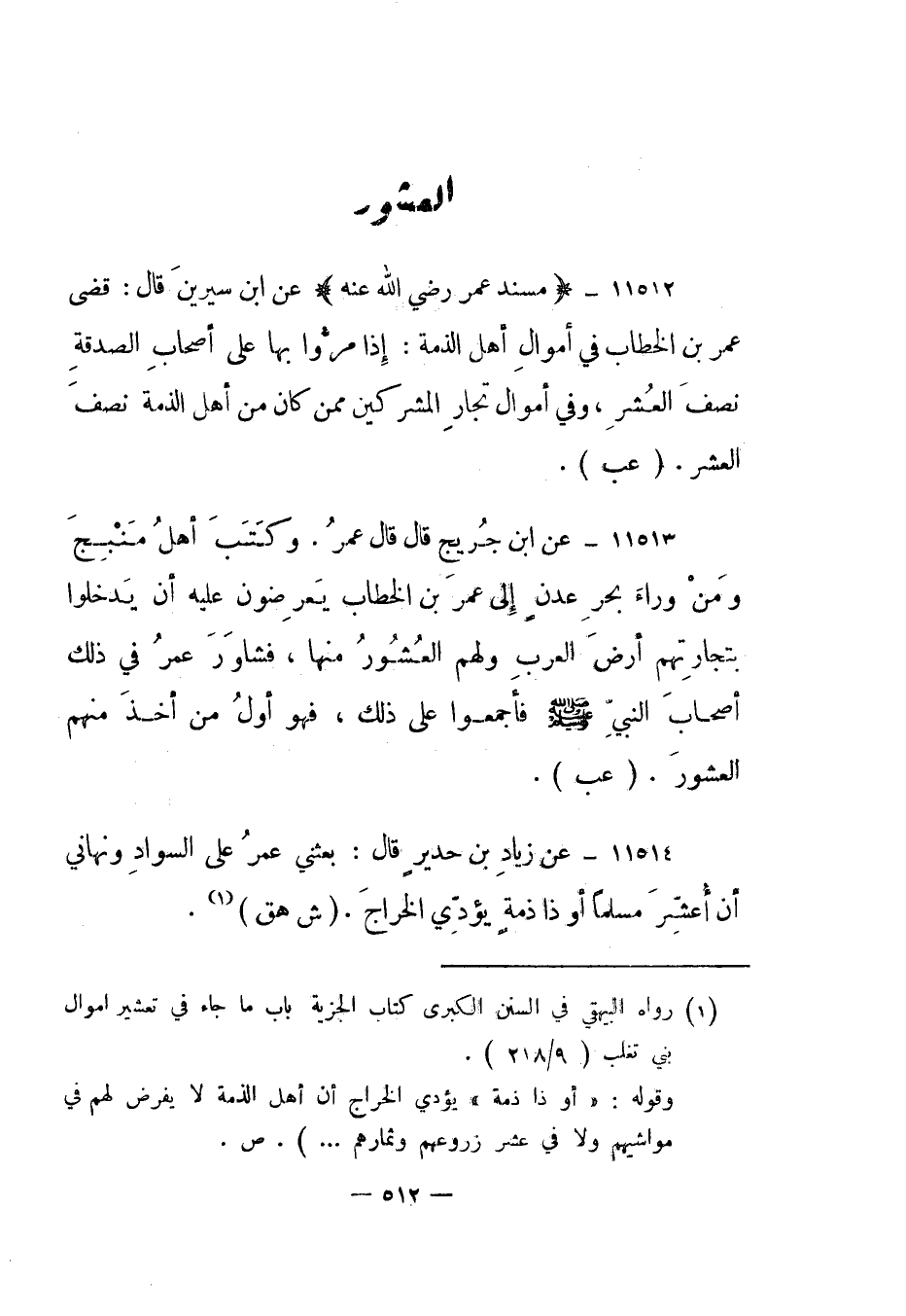 11512- "مسند عمر رضي الله عنه" عن ابن سيرين قال: قضى عمر بن الخطاب في أموال أهل الذمة: إذا مروا بها على أصحاب الصدقة نصف العشر، وفي أموال تجار المشركين ممن كان من أهل الذمة نصف العشر. "عب".
