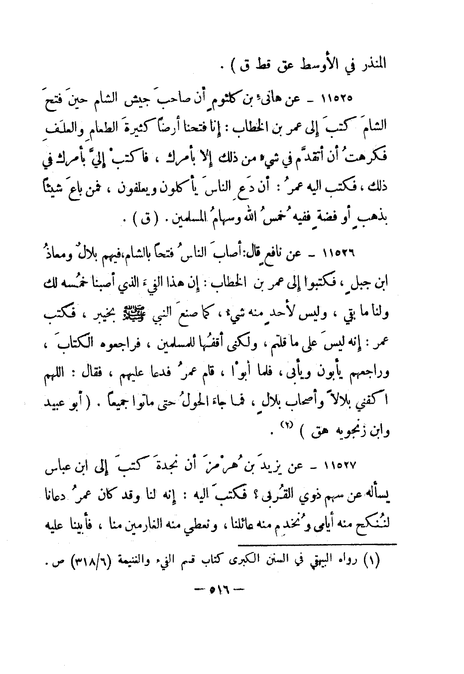 11525- عن هانئ بن كلثوم أن صاحب جيش الشام حين فتح الشام كتب إلى عمر بن الخطاب: إنا فتحنا أرضا كثيرة الطعام والعلف فكرهت أن أتقدم في شيء من ذلك إلا بأمرك، فاكتب إلي بأمرك في ذلك، فكتب إليه عمر: أن دع الناس يأكلون ويعلفون، فمن باع شيئا بذهب أو فضة ففيه خمس الله وسهام المسلمين. "ق".