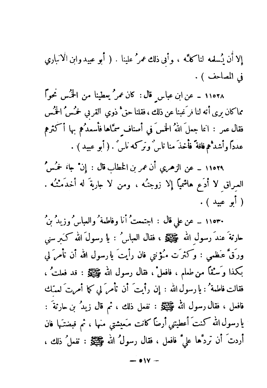 11528- عن ابن عباس قال: كان عمر يعطينا من الخمس نحوا مما كان يرى أنه لنا فرغبنا عن ذلك، فقلنا حق ذوي القربى خمس الخمس فقال عمر: إنما جعل الله الخمس في أصناف سماها فأسعدهم بها أكثرهم عددا وأشدهم فاقة فأخذ منا ناس وتركه ناس. "أبو عبيد".