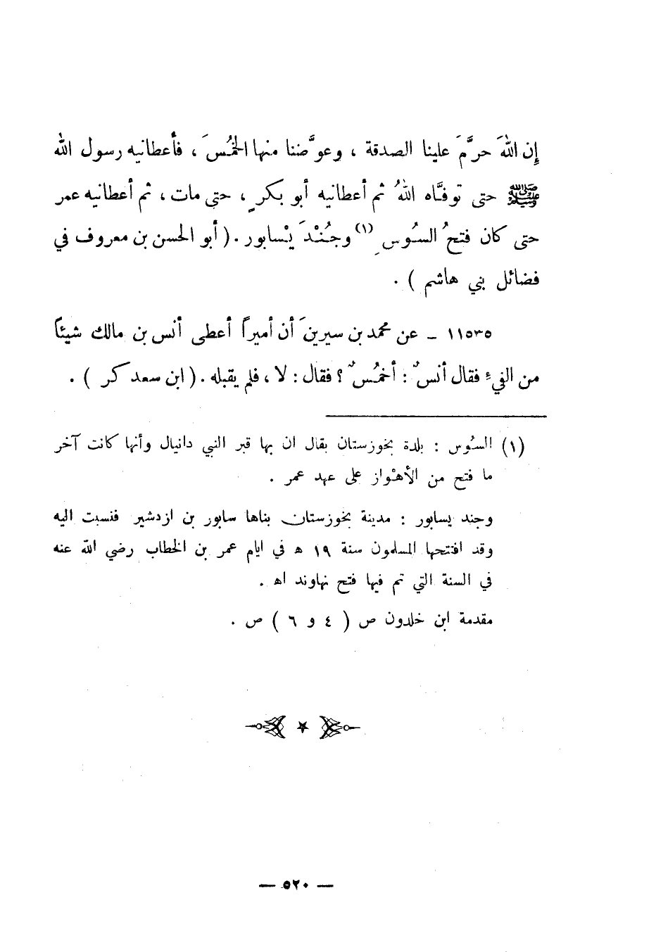 إن الله حرم علينا الصدقة، وعوضنا منها الخمس، فأعطانيه رسول الله صلى الله عليه وسلم حتى توفاه الله ثم أعطانيه أبو بكر، حتى مات، ثم أعطانيه عمر حتى كان فتح السوس 1 وجند يسابور. "أبو الحسن بن معروف في فضائل بني هاشم".