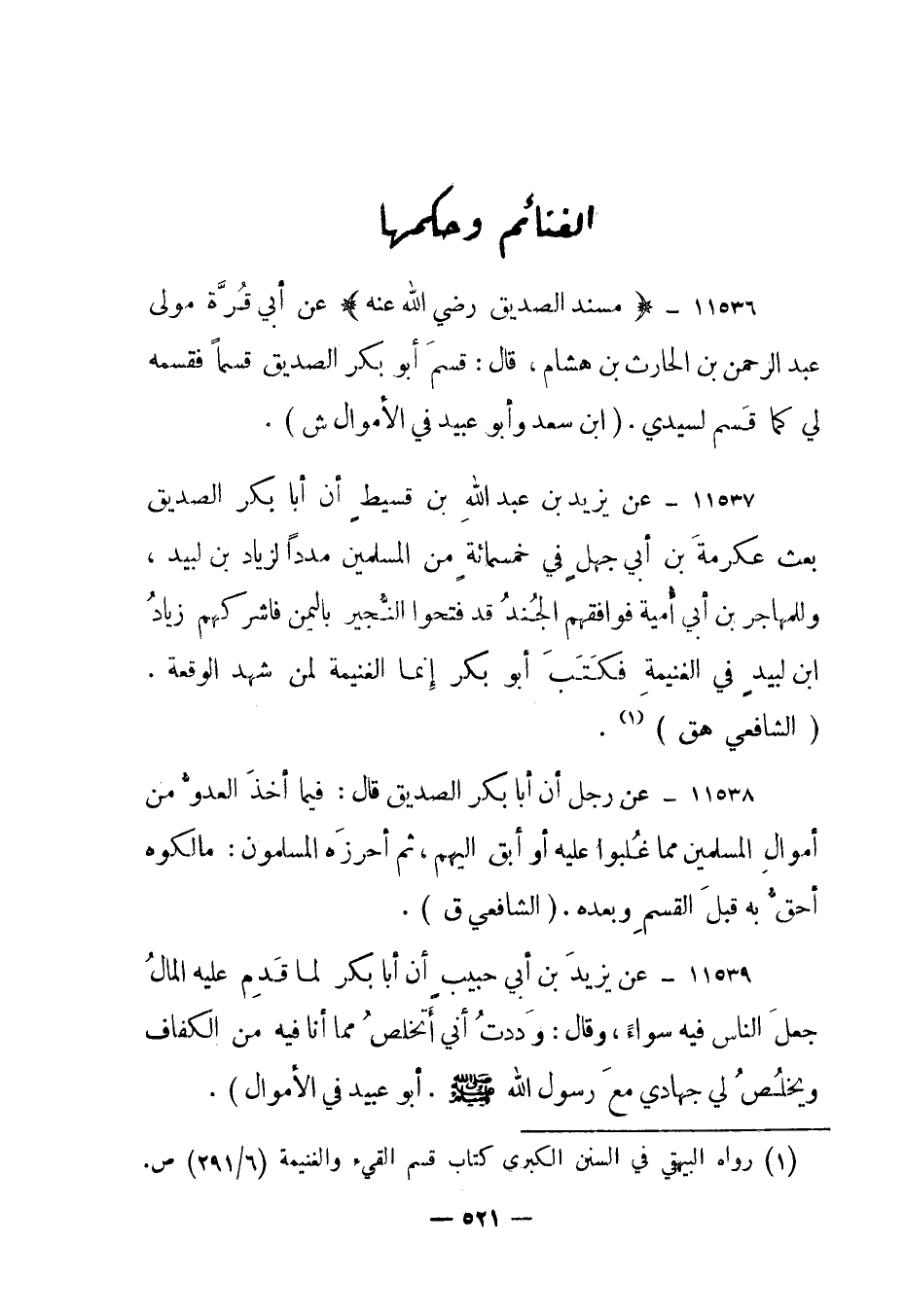 11538- عن رجل أن أبا بكر الصديق قال: فيما أخذ العدو من أموال المسلمين مما غلبوا عليه أو أبق إليهم، ثم أحرزه المسلمون: مالكوه أحق به قبل القسم وبعده. "الشافعي ق".