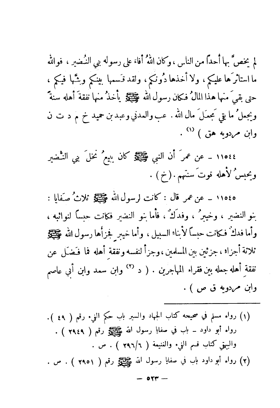 11544- عن عمر أن النبي صلى الله عليه وسلم كان يبيع نخل بني النضير ويحبس لأهله قوت سنتهم. "خ".
