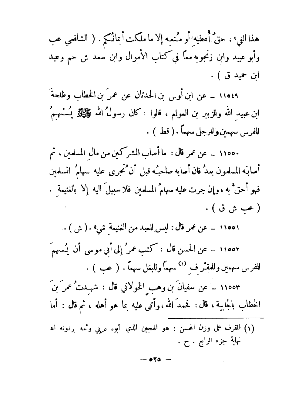 11549- عن ابن أوس بن الحدثان عن عمر بن الخطاب وطلحة ابن عبيد الله والزبير بن العوام، قالوا: كان رسول الله صلى الله عليه وسلم يسهم للفرس سهمين وللرجل سهما. "قط".