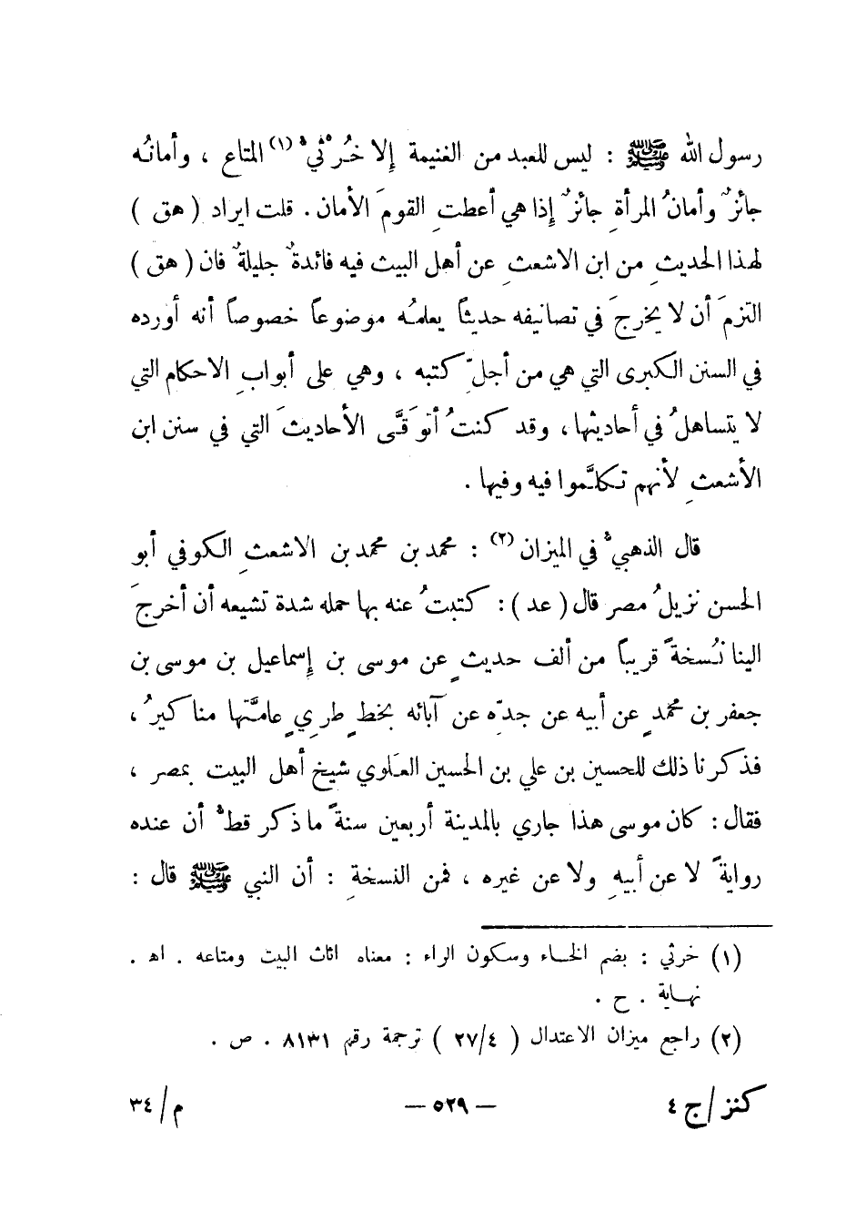 رسول الله صلى الله عليه وسلم: ليس للعبد من الغنيمة إلا خرثي 1 المتاع، وأمانه جائز وأمان المرأة جائز إذا هي أعطت القوم الأمان. قلت إيراد "هق" لهذا الحديث من ابن الأشعث عن أهل البيت فيه فائدة جليلة فإن "هق" التزم أن لا يخرج في تصانيفه حديثا يعلمه موضوعا خصوصا أنه أورده في السنن الكبرى التي هي من أجل كتبه، وهي على أبواب الأحكام التي لا يتساهل في أحاديثها، وقد كنت أتوقى الأحاديث التي في سنن ابن الأشعث لأنهم تكلموا فيه وفيها.