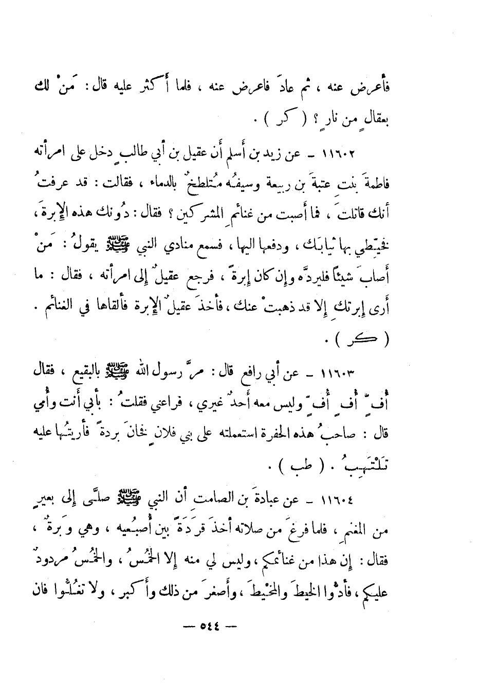 11604- عن عبادة بن الصامت أن النبي صلى الله عليه وسلم صلى إلى بعير من المغنم، فلما فرغ من صلاته أخذ قردة بين أصبعيه، وهي وبرة، فقال: إن هذا من غنائمكم، وليس لي منه إلا الخمس، والخمس مردود عليكم، فأدوا الخيط والمخيط، وأصغر من ذلك وأكبر، ولا تغلوا فإن