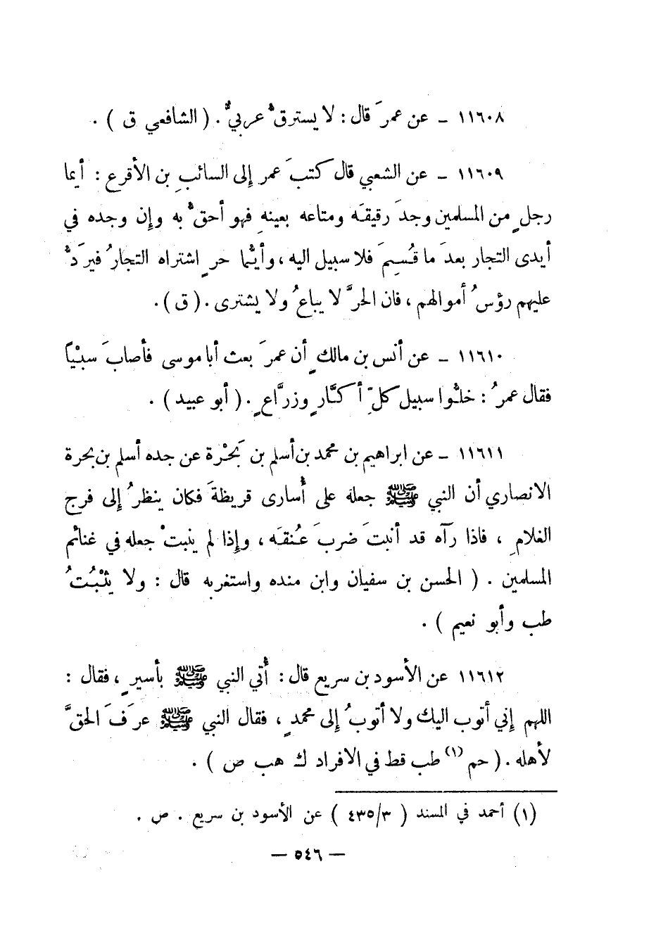 11610- عن أنس بن مالك أن عمر بعث أبا موسى فأصاب سبيا فقال عمر: خلوا سبيل كل أكار وزراع. "أبو عبيد".