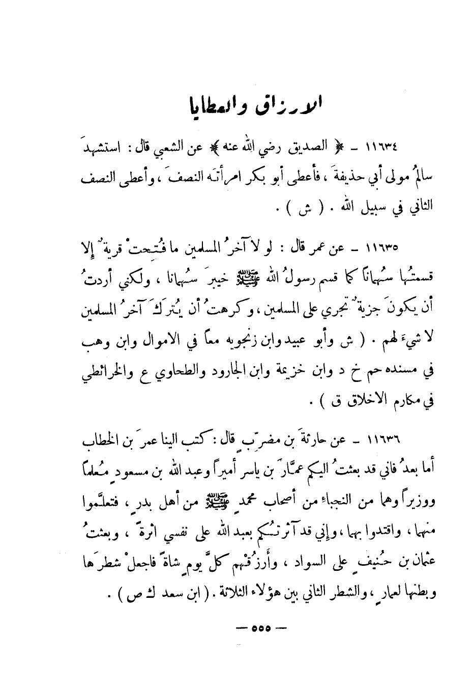 11634- "الصديق رضي الله عنه" عن الشعبي قال: استشهد سالم مولى أبي حذيفة، فأعطى أبو بكر امرأته النصف، وأعطى النصف الثاني في سبيل الله. "ش".