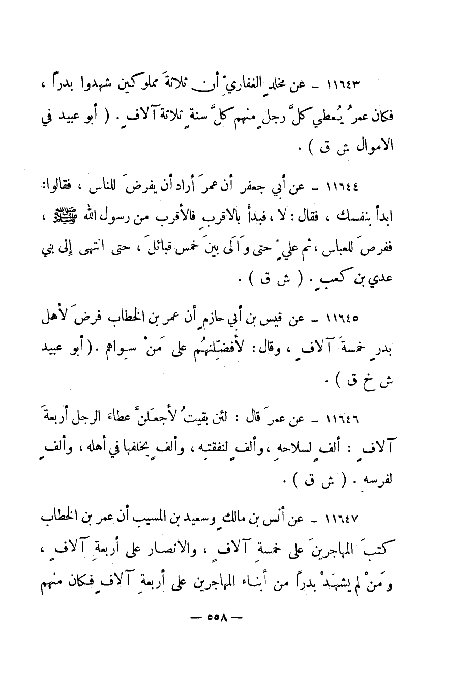 11643- عن مخلد الغفاري أن ثلاثة مملوكين شهدوا بدرا، فكان عمر يعطي كل رجل منهم كل سنة ثلاثة آلاف. "أبو عبيد في الأموال ش ق".
