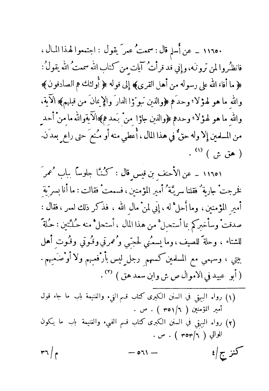 11650- عن أسلم قال: سمعت عمر يقول: اجتمعوا لهذا المال، فانظروا لمن ترونه، وإني قد قرأت آيات من كتاب الله سمعت الله يقول: {مَا أَفَاءَ اللَّهُ عَلَى رَسُولِهِ مِنْ أَهْلِ الْقُرَى} إلى قوله {أُولَئِكَ هُمُ الصَّادِقُونَ} والله ما هو لهؤلاء وحدهم {وَالَّذِينَ تَبَوَّأُوا الدَّارَ وَالْأِيمَانَ مِنْ قَبْلِهِمْ} الآية، والله ما هو لهؤلاء وحدهم {وَالَّذِينَ جَاءُوا مِنْ بَعْدِهِمْ} الآية والله ما من أحد من المسلمين إلا وله حق في هذا المال، أعطي منه أو منع حتى راع بعدن. "هق ش"1.