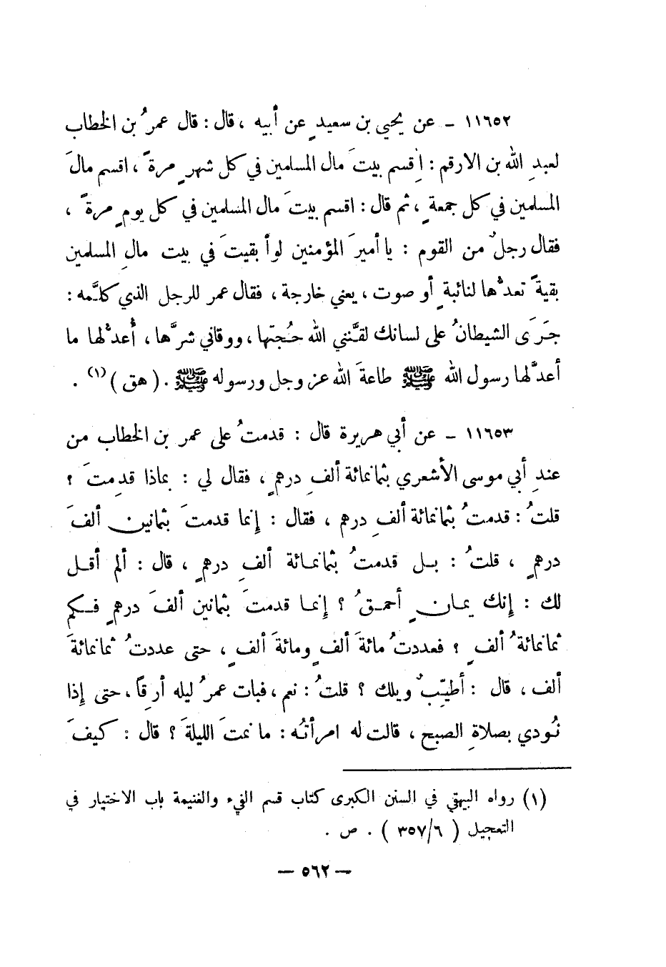 11652- عن يحيى بن سعيد عن أبيه، قال: قال عمر بن الخطاب لعبد الله بن الأرقم: اقسم بيت مال المسلمين في كل شهر مرة، اقسم مال المسلمين في كل جمعة، ثم قال: اقسم بيت مال المسلمين في كل يوم مرة، فقال رجل من القوم: يا أمير المؤمنين لو أبقيت في بيت مال المسلمين بقية تعدها لنائبة أو صوت، يعني خارجة، فقال عمر للرجل الذي كلمه: جرى الشيطان على لسانك لقنني الله حجتها، ووقاني شرها، أعد لها ما أعد لها رسول الله صلى الله عليه وسلم طاعة الله عز وجل ورسوله صلى الله عليه وسلم. "هق"1.