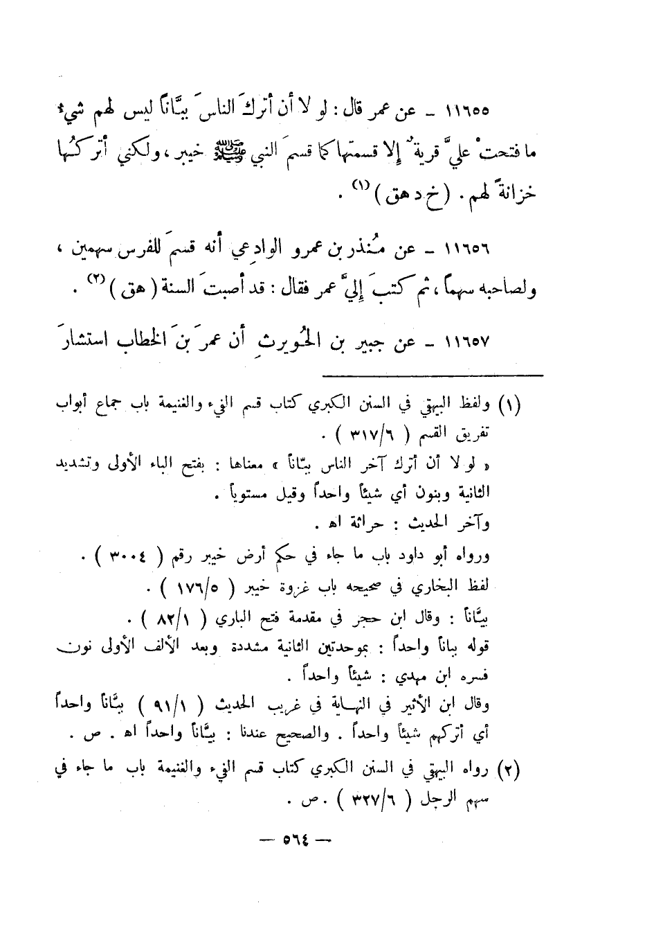 11655- عن عمر قال: لولا أن أترك الناس ببانا ليس لهم شيء ما فتحت علي قرية إلا قسمتها كما قسم النبي صلى الله عليه وسلم خيبر، ولكني أتركها خزانة لهم. "خ د هق"1.
