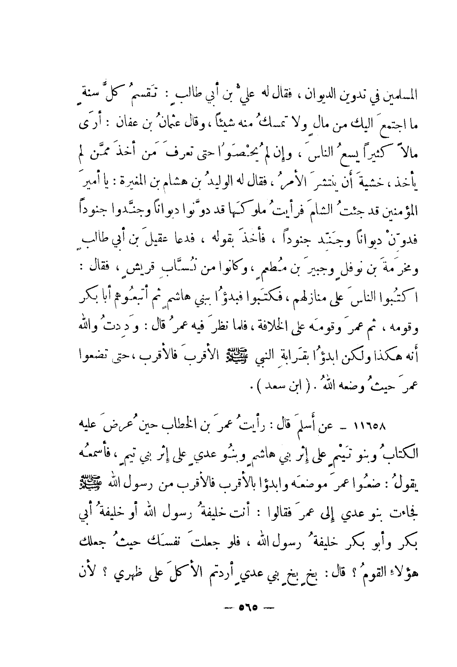 11658- عن أسلم قال: رأيت عمر بن الخطاب حين عرض عليه الكتاب وبنو تيم على إثر بني هاشم وبنو عدي على إثر بني تيم، فأسمعه يقول: ضعوا عمر موضعه وابدؤا بالأقرب فالأقرب من رسول الله صلى الله عليه وسلم فجاءت بنو عدي إلى عمر فقالوا: أنت خليفة رسول الله أو خليفة أبي بكر وأبو بكر خليفة رسول الله، فلو جعلت نفسك حيث جعلك هؤلاء القوم؟ قال: بخ بخ بني عدي أردتم الأكل على ظهري؟ لأن