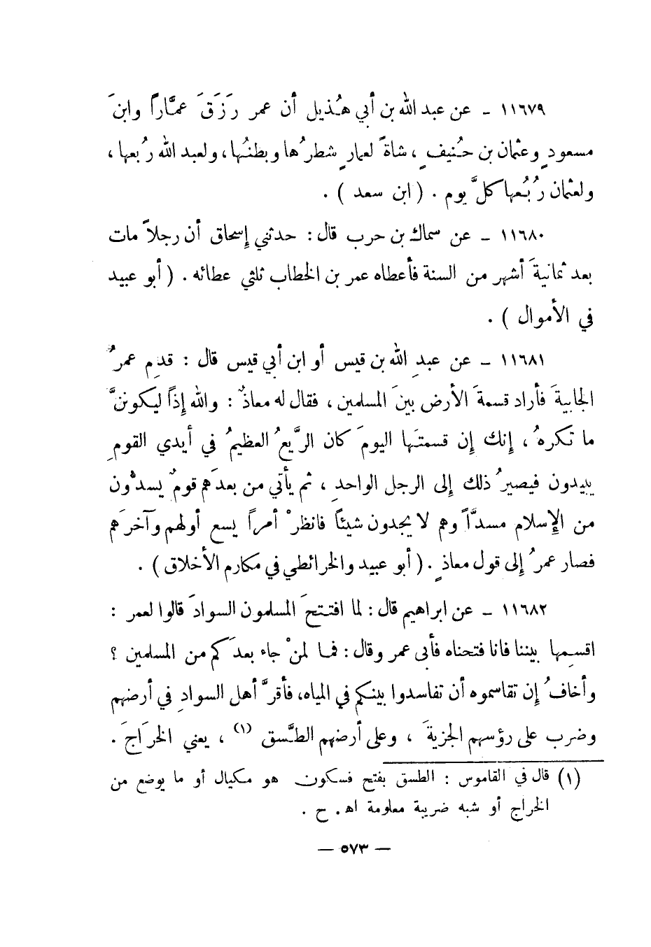 11682- عن إبراهيم قال: لما افتتح المسلمون السواد قالوا لعمر: اقسمها بيننا فإنا فتحناه فأبى عمر وقال: فما لمن جاء بعدكم من المسلمين؟ وأخاف إن تقاسموا أن تفاسدوا بينكم في المياه، فأقر أهل السواد في أرضهم وضرب على رؤسهم الجزية، وعلى أرضهم الطسق1، يعني الخراج.