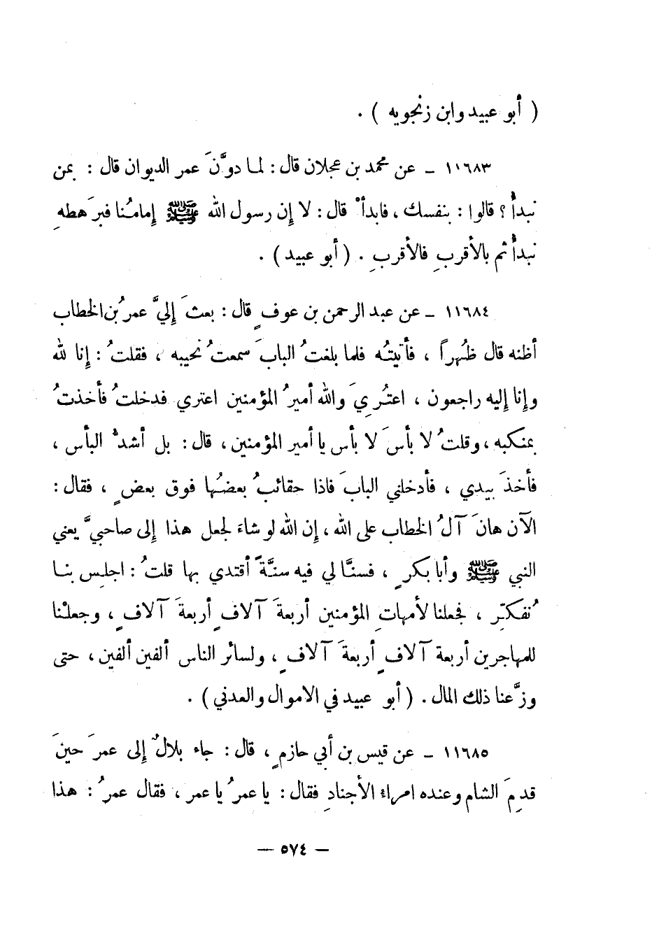 11684- عن عبد الرحمن بن عوف قال: بعث إلي عمر بن الخطاب أظنه قال ظهرا، فأتيته فلما بلغت الباب سمعت نحيبه، فقلت: إنا لله وإنا إليه راجعون، اعتري والله أمير المؤمنين اعتري فدخلت فأخذت بمنكبه، وقلت لا بأس لا بأس يا أمير المؤمنين، قال: بل أشد البأس، فأخذ بيدي، فأدخلني الباب فإذا حقائب بعضها فوق بعض، فقال: الآن هان آل الخطاب على الله، إن الله لو شاء لجعل هذا إلى صاحبي يعني النبي صلى الله عليه وسلم وأبا بكر، فسنا لي فيه سنة أقتدي بها قلت: اجلس بنا نفكر، فجعلنا لأمهات المؤمنين أربعة آلاف أربعة آلاف، وجعلنا للمهاجرين أربعة آلاف أربعة آلاف، ولسائر الناس ألفين ألفين، حتى وزعنا ذلك المال. "أبو عبيد في الأموال والعدني".