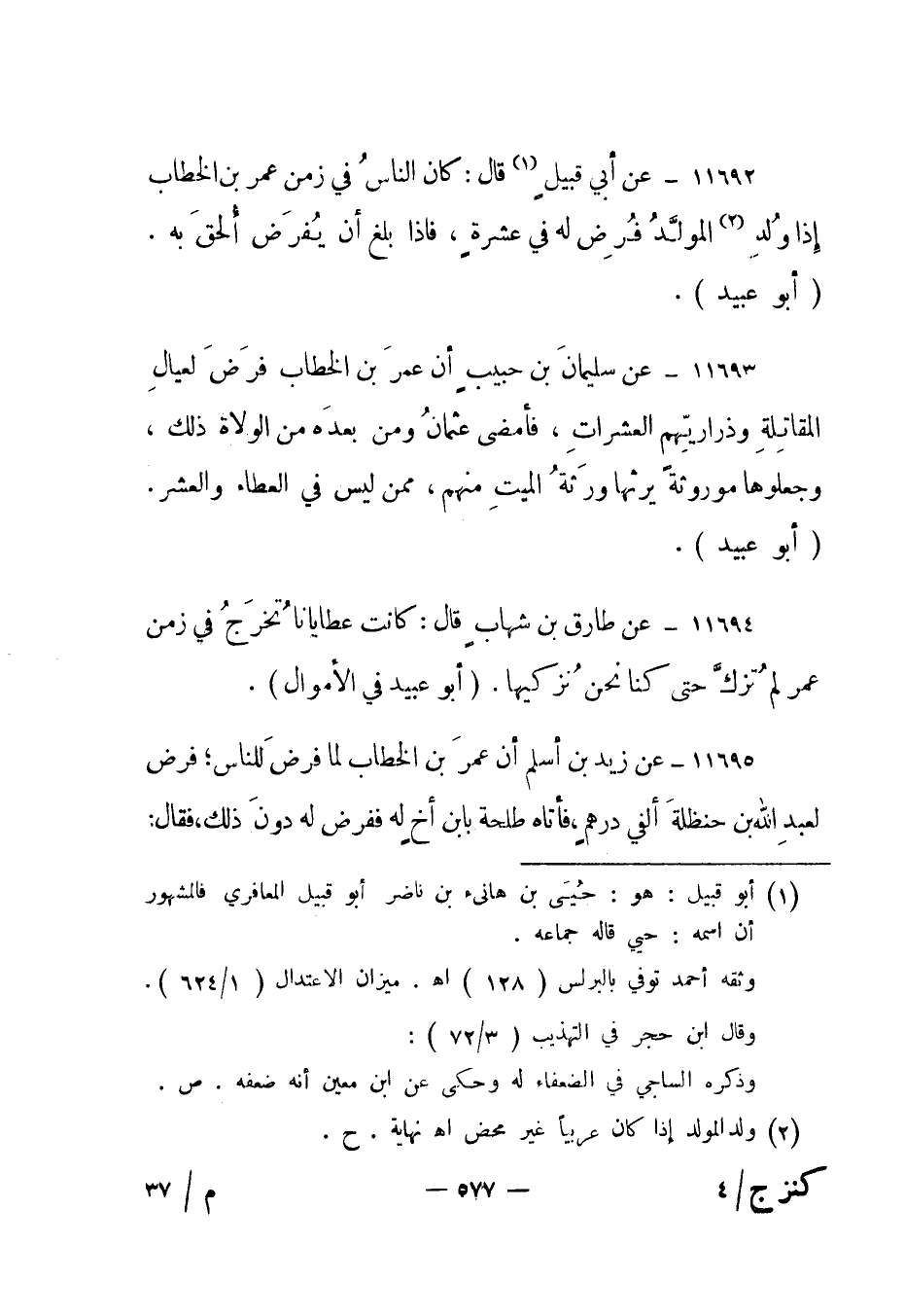 11692- عن أبي قبيل 1 قال: كان الناس في زمن عمر بن الخطاب إذا ولد 2 المولد فرض له في عشرة، فإذا بلغ أن يفرض ألحق به. "أبو عبيد".