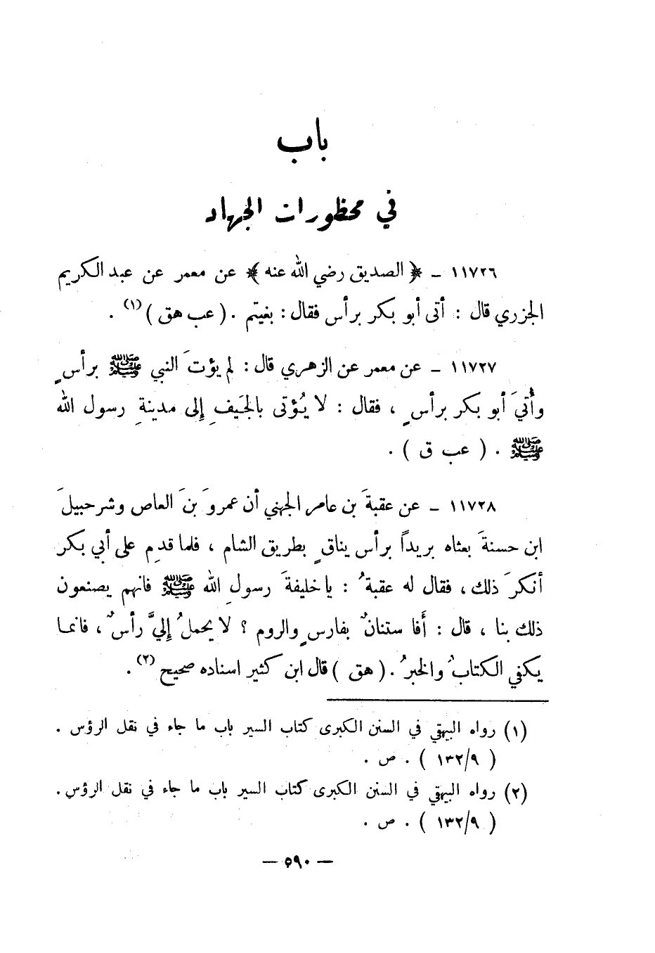 1 رواه البيهقي في السنن الكبرى كتاب السير باب ما جاء في نقل الرؤس. "9/132". ص.