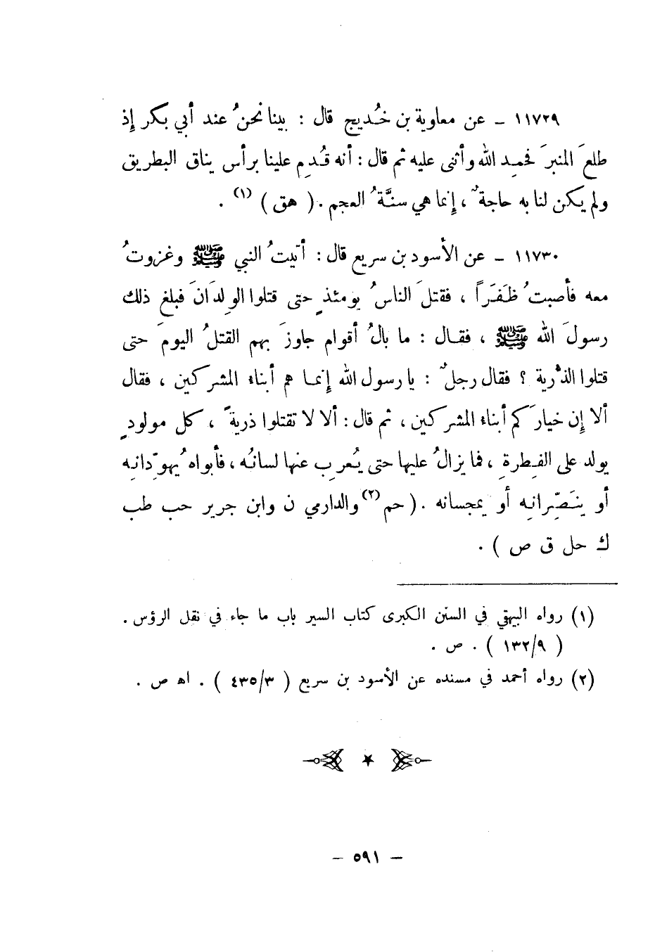 11730- عن الأسود بن سريع قال: أتيت النبي صلى الله عليه وسلم وغزوت معه فأصبت ظفرا، فقتل الناس يومئذ حتى قتلوا الولدان فبلغ ذلك رسول الله صلى الله عليه وسلم، فقال: ما بال أقوام جاوز بهم القتل اليوم حتى قتلوا الذرية؟ فقال رجل: يا رسول الله إنما هم أبناء المشركين، فقال ألا إن خياركم أبناء المشركين، ثم قال: ألا لا تقتلوا ذرية، كل مولود يولد على الفطرة، فما يزال عليها حتى يعرب عنها لسانه، فأبواه يهودانه أو ينصرانه أو يمجسانه. "حم 2 والدارمي ن وابن جرير حب طب ك حل ق ص".