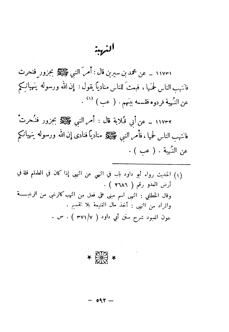 11732- عن أبي قلابة قال: أمر النبي صلى الله عليه وسلم بجزور فنحرت فانتهب الناس لحمها، فأمر النبي صلى الله عليه وسلم مناديا فنادى إن الله ورسوله ينهيانكم عن النهبة. "عب".
