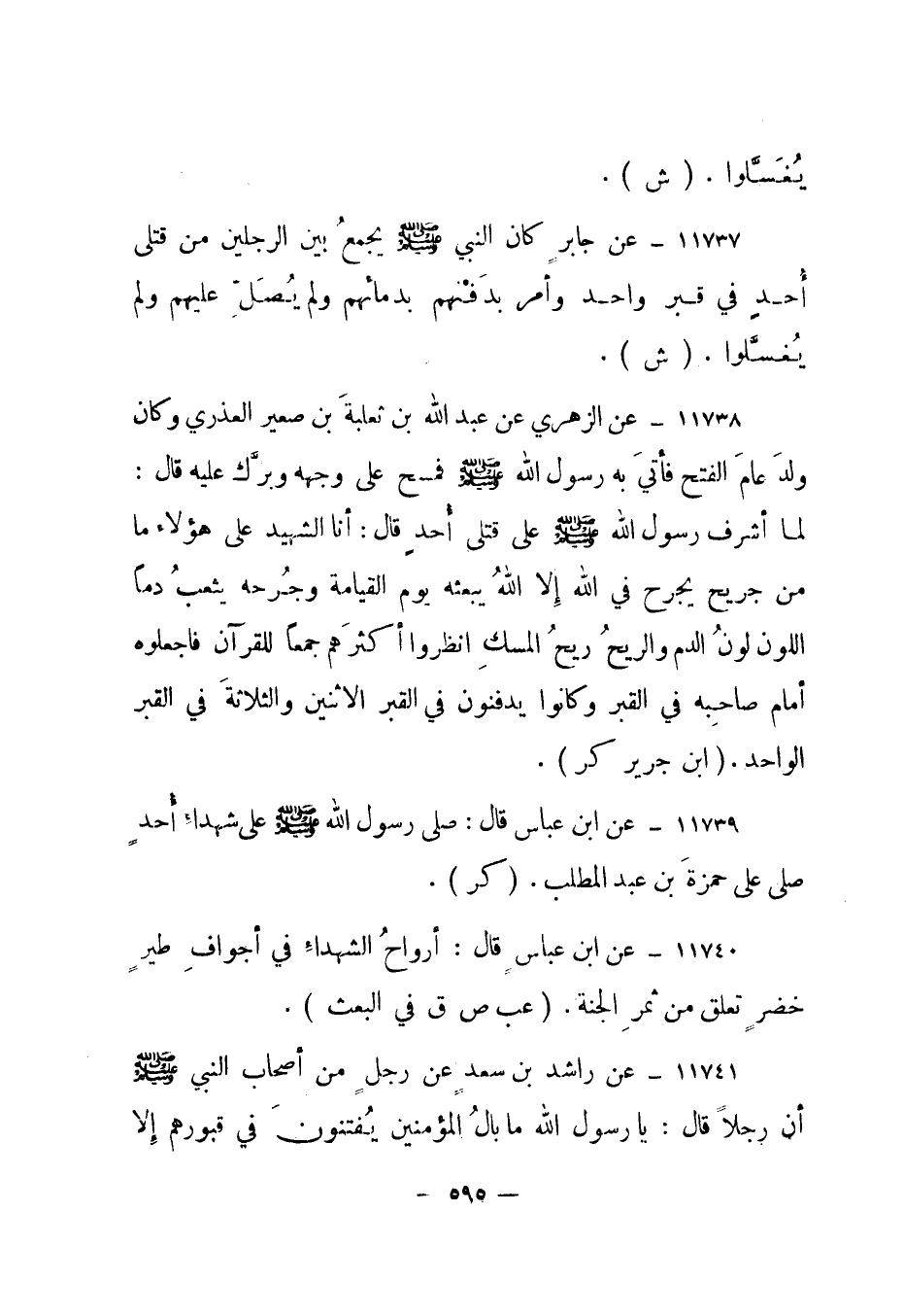 11737- عن جابر كان النبي صلى الله عليه وسلم يجمع بين الرجلين من قتلى أحد في قبر واحد وأمر بدفنهم بدمائهم ولم يصل عليهم ولم يغسلوا. "ش".