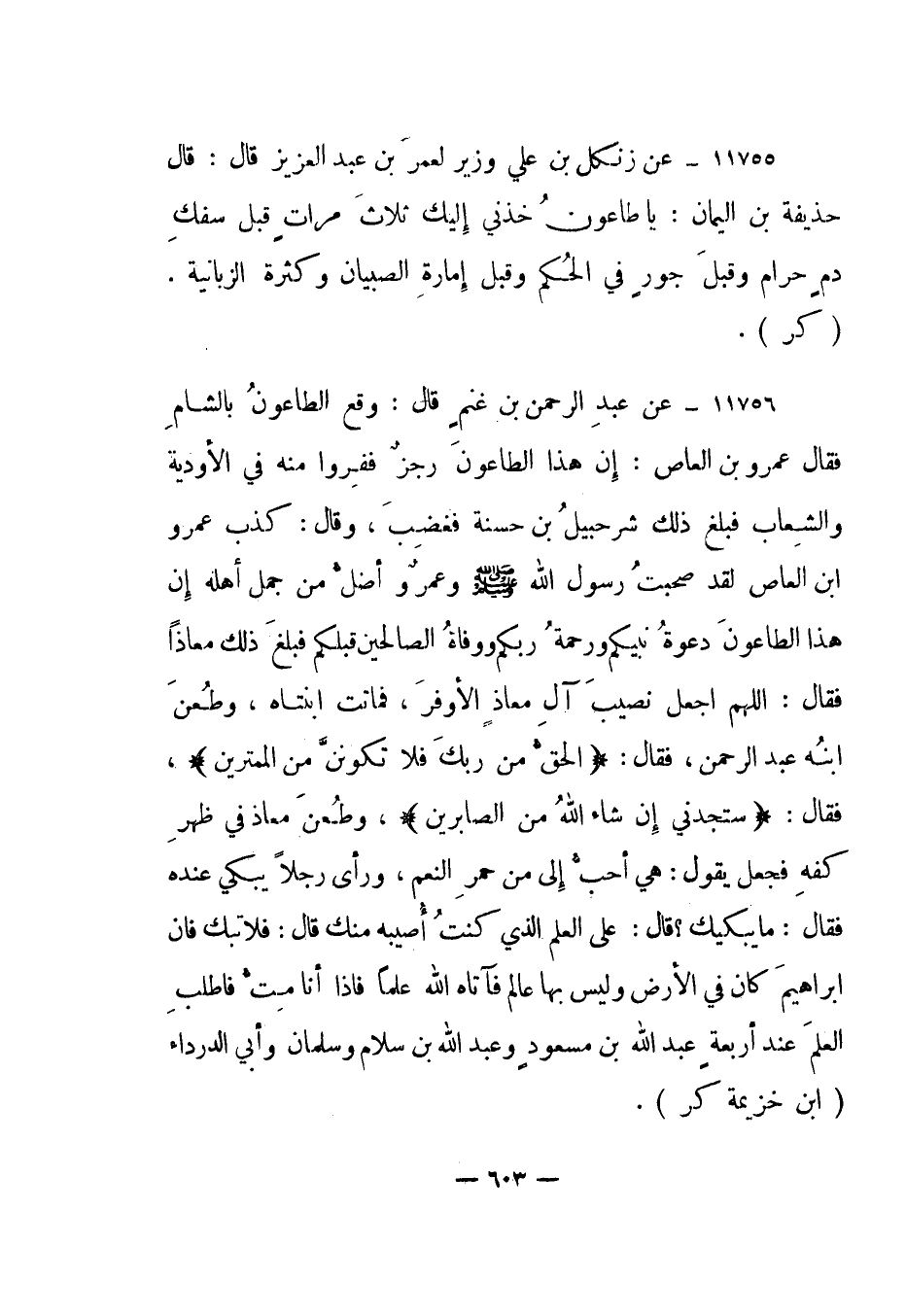11756- عن عبد الرحمن بن غنم قال: وقع الطاعون بالشام فقال عمرو بن العاص: إن هذا الطاعون رجز ففروا منه في الأودية والشعاب فبلغ شرحبيل بن حسنة فغضب، وقال: كذب عمرو بن العاص لقد صحبت رسول الله صلى الله عليه وسلم وعمرو أضل من جمل أهله إن هذا الطاعون دعوة نبيكم ورحمة ربكم ووفاة الصالحين قبلكم فبلغ ذلك معاذا فقال: اللهم اجعل نصيب آل معاذ الأوفر، فماتت ابنتاه، وطعن ابنه عبد الرحمن، فقال: {الْحَقُّ مِنْ رَبِّكَ فَلا تَكُونَنَّ مِنَ الْمُمْتَرِينَ} ، فقال: {سَتَجِدُنِي إِنْ شَاءَ اللَّهُ مِنَ الصَّابِرِينَ} ، وطعن معاذ في ظهر كفه فجعل يقول: هي أحب إلي من حمر النعم، ورأى رجلا يبكي عنده فقال: ما يبكيك؟ قال: على العلم الذي كنت أصيبه منك قال: فلا تبك فإن إبراهيم كان في الأرض وليس بها عالم فآتاه الله علما فإذا أنا مت فاطلب العلم عند أربعة عبد الله بن مسعود وعبد الله بن سلام وسلمان وأبي الدرداء. "ابن خزيمة كر".