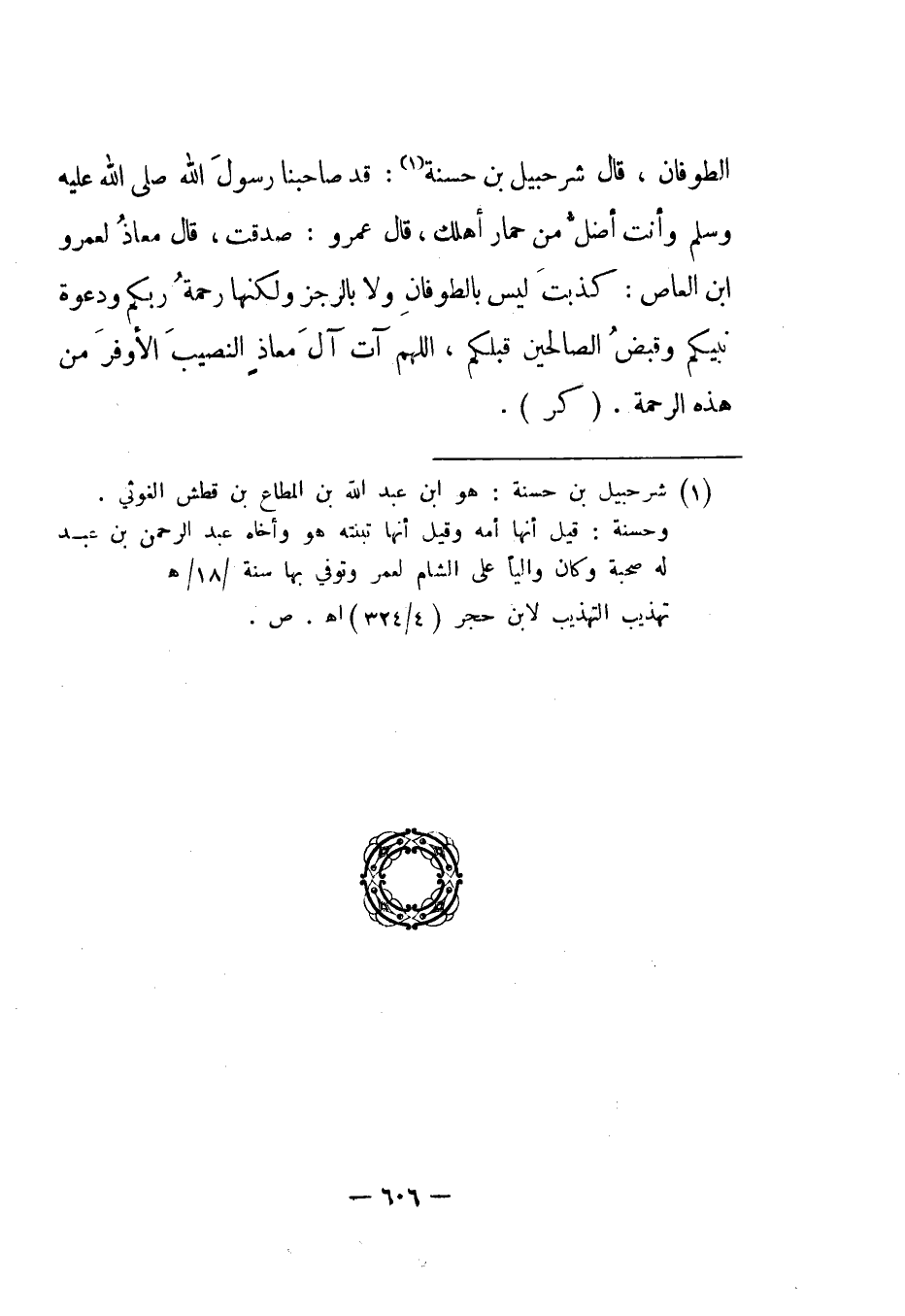 الطوفان، قال شرحبيل بن حسنة1: قد صاحبنا رسول الله صلى الله عليه وسلم وأنت أضل من حمار أهلك، قال عمرو: صدقت، قال معاذ لعمرو ابن العاص: كذبت ليس بالطوفان ولا بالرجز ولكنها رحمة ربكم ودعوة نبيكم وقبض الصالحين قبلكم، اللهم آت آل معاذ النصيب الأوفر من هذه الرحمة. "كر".