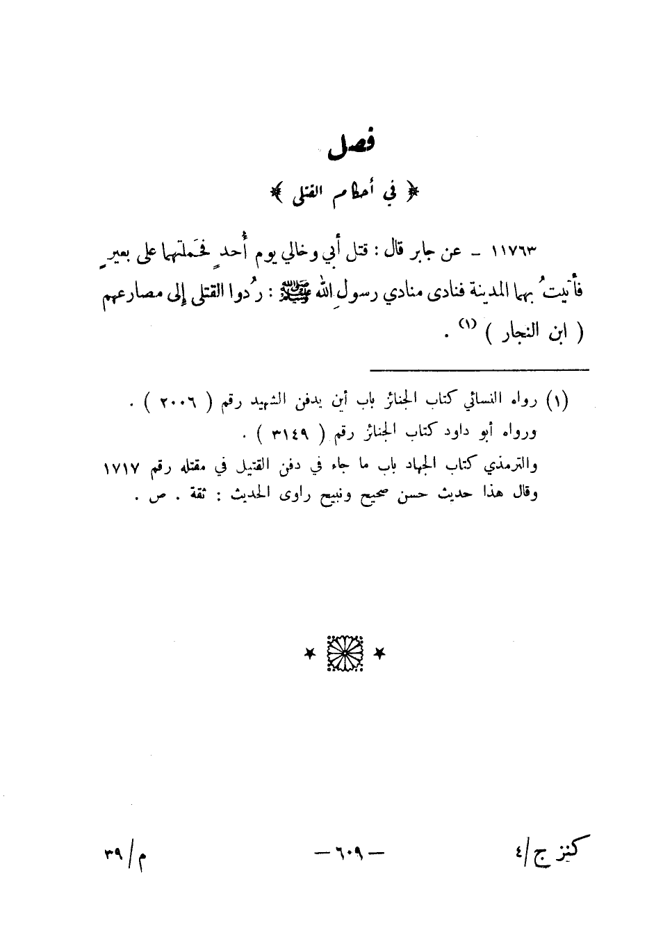 11763- عن جابر قال: قتل أبي وخالي يوم أحد فحملتهما على بعير فأتيت بهما المدينة فنادى منادي رسول الله صلى الله عليه وسلم: ردوا القتلى إلى مصارعهم. "ابن النجار"1.