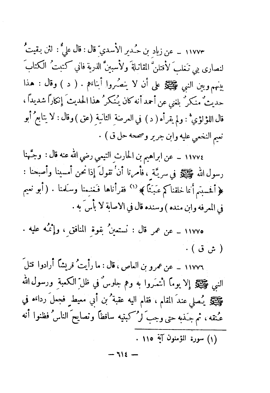 11774- عن إبراهيم بن الحارث التيمي رضي الله عنه قال: وجهنا رسول الله صلى الله عليه وسلم في سرية، فأمرنا أن نقول إذا نحن أمسينا وأصبحنا: {أَفَحَسِبْتُمْ أَنَّمَا خَلَقْنَاكُمْ عَبَثاً} 1 فقرأناها فغنمنا وسلمنا. "أبو نعيم في المعرفة وابن منده" وسنده قال في الإصابة لا بأس به.
