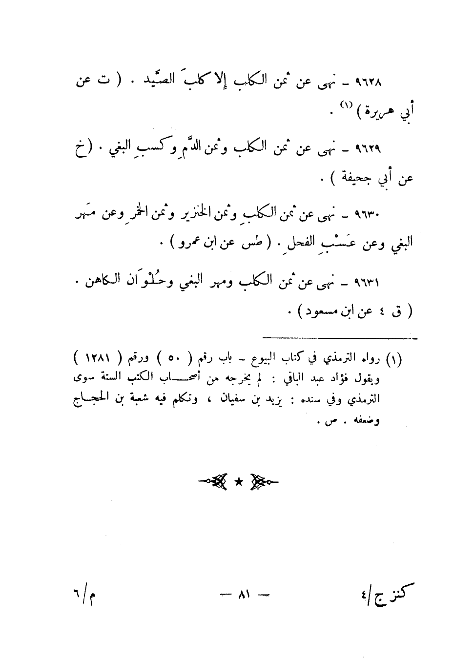 9631- "نهى عن ثمن الكلب ومهر البغي وحلوان الكاهن". "ق 4 عن ابن مسعود".