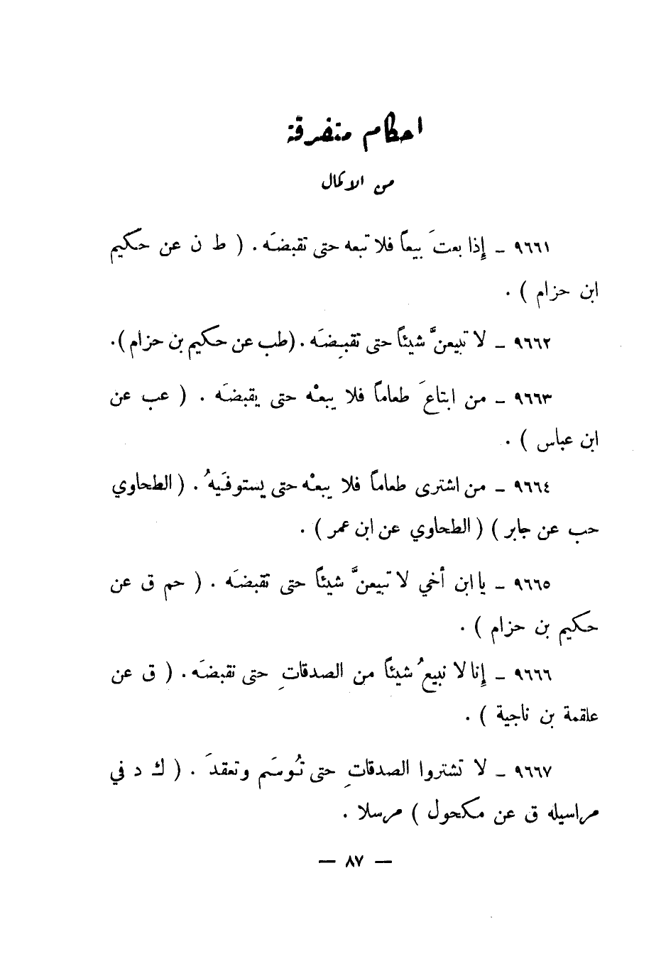 9662- "لا تبيعن شيئا حتى تقبضه". "طب عن حكيم بن حزام".