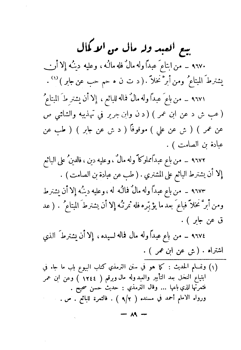 9670- "من ابتاع عبدا وله مال فله ماله، وعليه دينه إلا أن يشترط المبتاع ومن أبر نخلا". "د ت ن هـ حم حب عن جابر" 1.