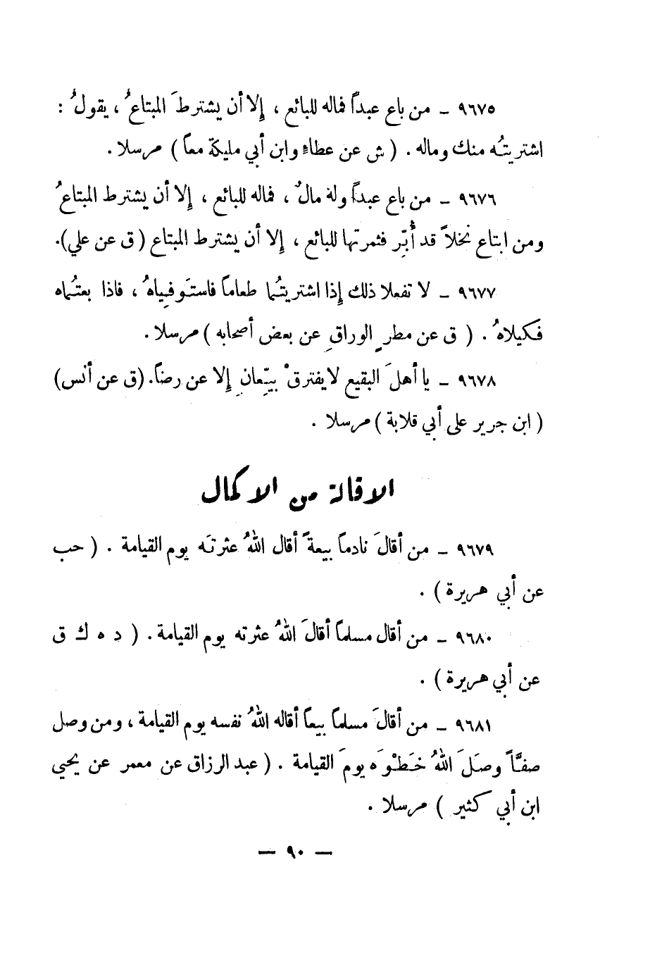 9681- "من أقال مسلما بيعا أقاله الله نفسه يوم القيامة، ومن وصل صفا وصل الله خطوه يوم القيامة". "عبد الرزاق عن معمر عن يحيى ابن أبي كثير" مرسلا.