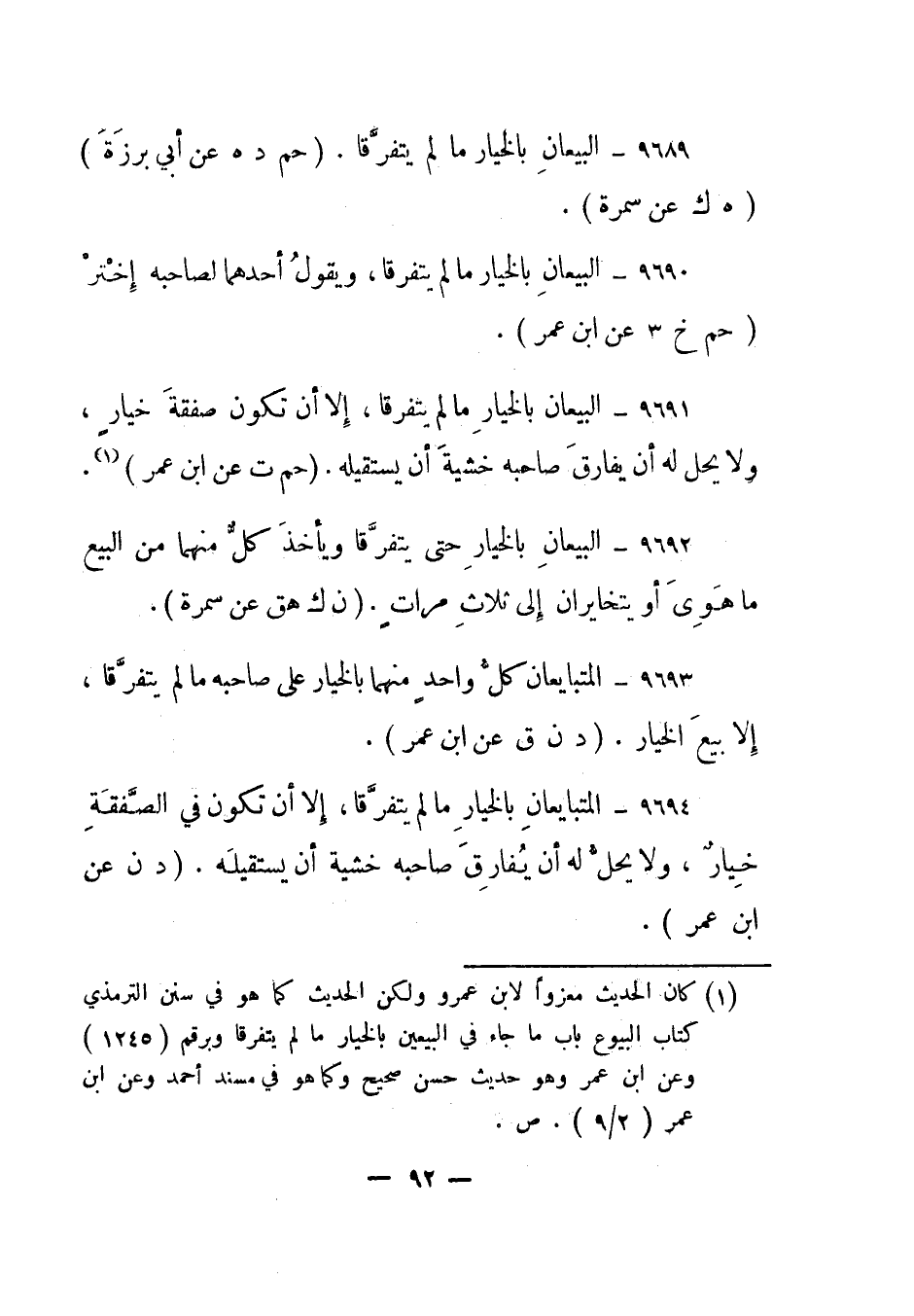 9690- "البيعان بالخيار ما لم يتفرقا، ويقول أحدهما لصاحبه إختر". "حم خ 3 عن ابن عمر".