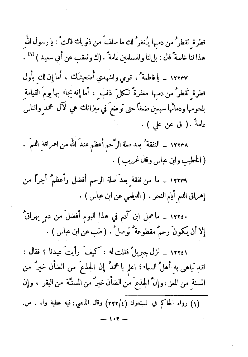 12237- يا فاطمة، قومي واشهدي أضحيتك، أما إن لك بأول قطرة تقطر من دمها مغفرة لكل ذنب، أما إنه يجاء بها يوم القيامة بلحومها ودمائها سبعين ضعفا حتى توضع في ميزانك هي لآل محمد والناس عامة. "ق عن علي".