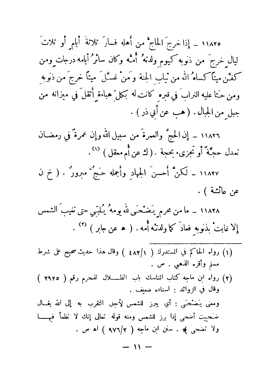 11828 - ما من محرم يضحى لله يومه يلبي حتى تغيب الشمس إلا غابت بذنوبه فعاد كما ولدته أمه. " هـ عن جابر"2