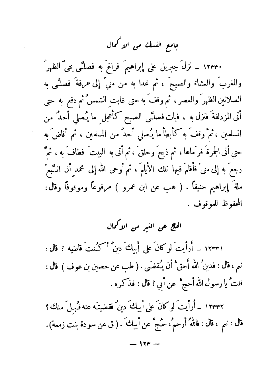 12330- نزل جبريل على إبراهيم فراغ به فصلى بمنى الظهر والمغرب والعشاء والصبح، ثم غدا به من منى إلى عرفة فصلى به الصلاتين الظهر والعصر، ثم وقف به حتى غابت الشمس ثم دفع به حتى أتى المزدلفة فنزل به، فبات فصلى الصبح كأعجل ما يصلي أحد من المسلمين، ثم وقف به كأبطأ ما يصلي أحد من المسلمين، ثم أفاض به حتى أتى الجمرة فرماها، ثم ذبح وحلق، ثم أتى به البيت فطاف به، ثم رجع به إلى منى فأقام فيها تلك الأيام، ثم أوحى الله إلى محمد أن اتبع ملة إبراهيم حنيفا. "هب عن ابن عمرو" مرفوعا وموقوفا وقال: المحفوظ للموقوف.